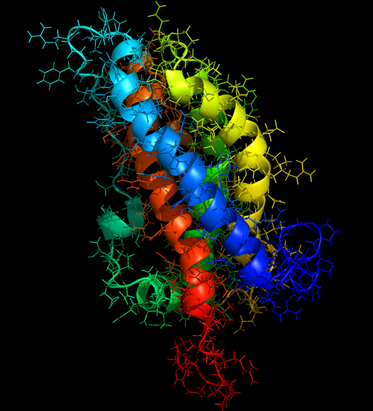 (Cartoon representation. The image was created by me with the help of PyMol - open source tool for molecular visualization/exploration. PDB-file was obtained from PDB)