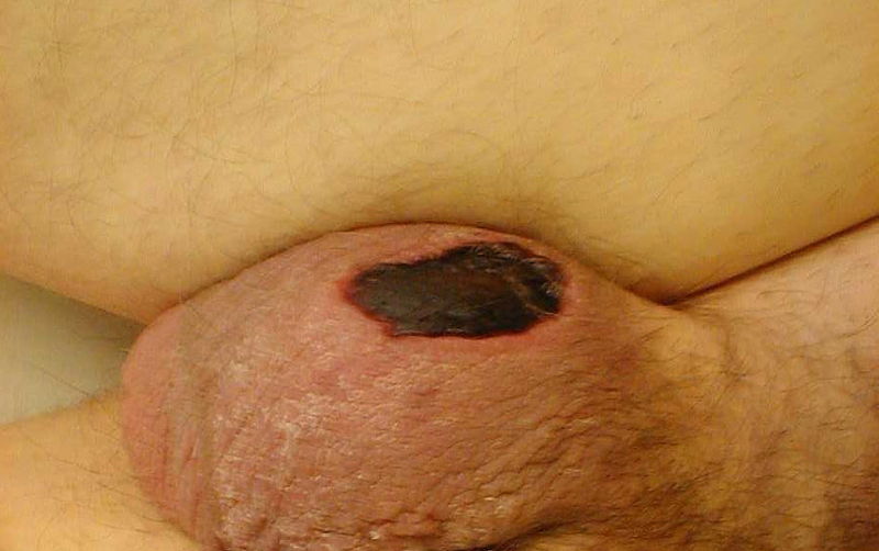By the time he got home, he was feeling nauseous and vomiting his guts out, and his scrotum was visibly swollen, and painful to touch.