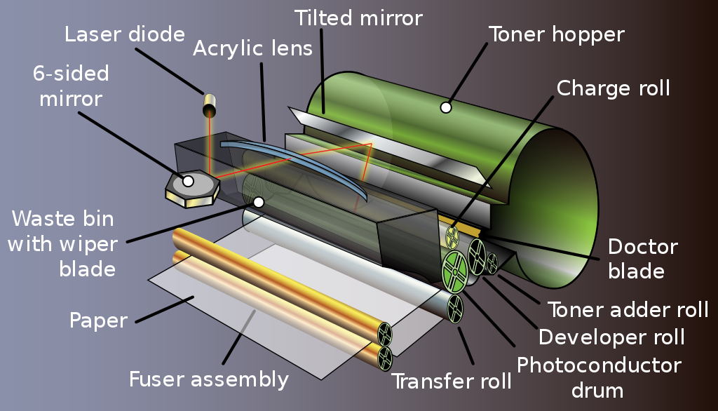 [Components of laser printers. Credit: Wikimedia. Creative Commons Attribution-Share Alike 4.0 International license. Author: KDS4444.]