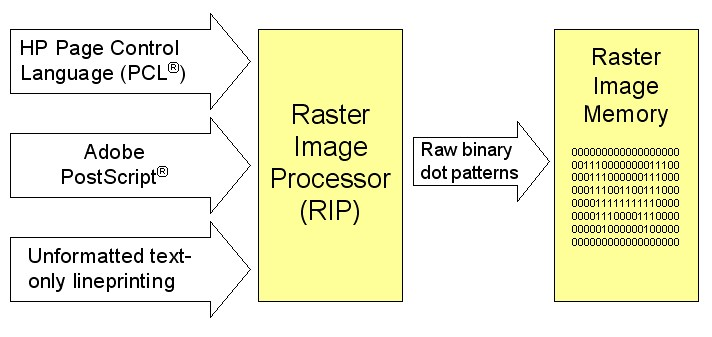 Once a user issues a print command using the application program, the digital copy is sent to the printer in a format known as the description language. A specialized processor called the RIP (Raster Image Processor) receives this digital copy formatted in a description language and further formats the incoming digital signal into electrical signal which will be interpreted as several dots to make readable impressions on paper.