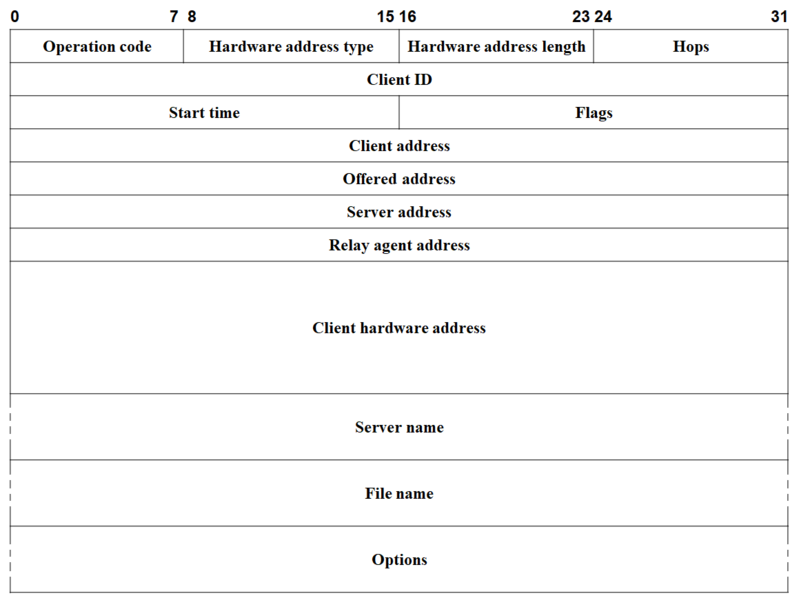 [A DHCP header showing different fields used by each DHCP operation. Credit: Wikimedia. CC4.0 license. Author: MichelBakni]