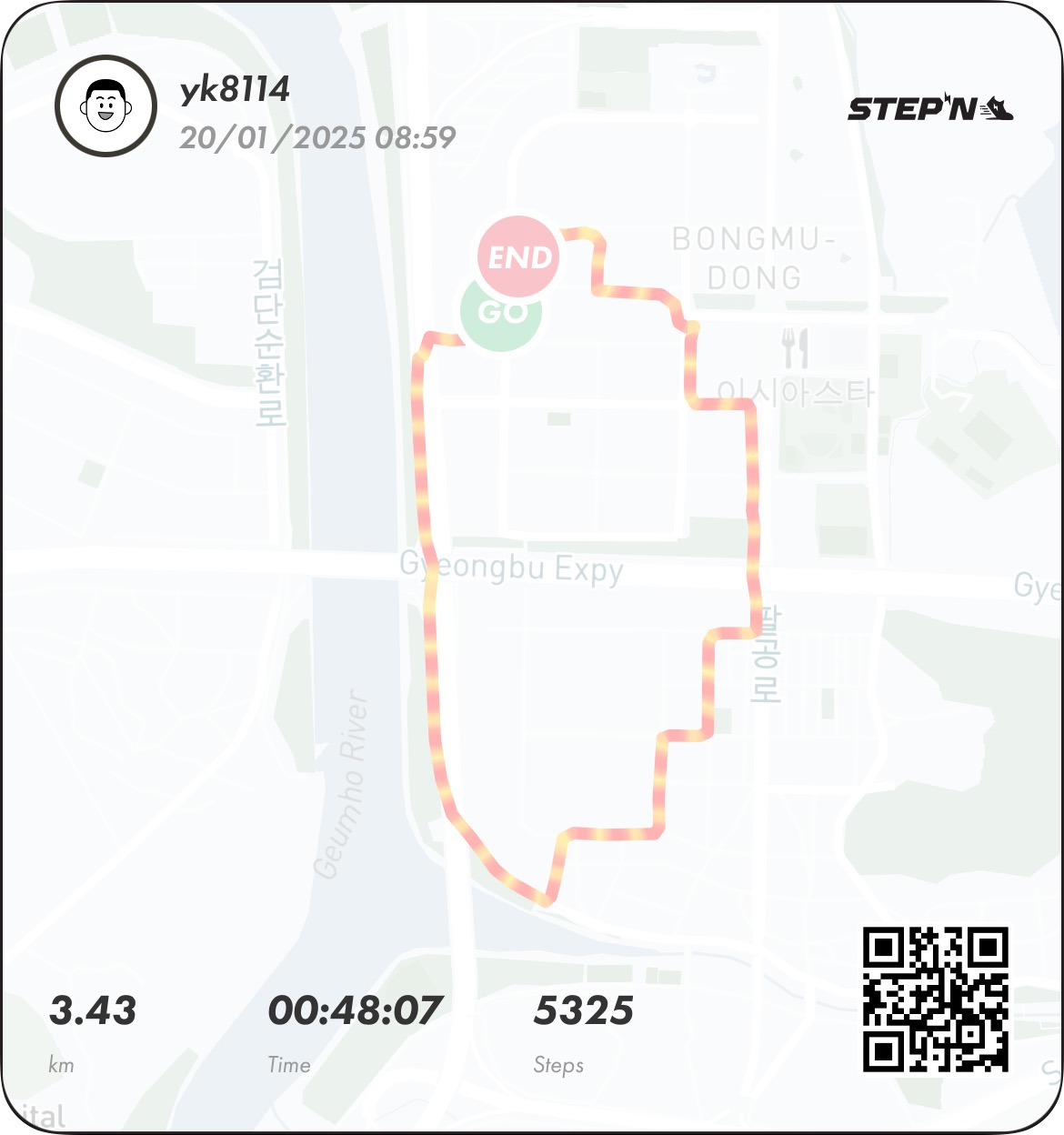 [25/01/20] 건강 투자하자~!! 오운완 3.43km (목표 2km)sjsr (58)in #stepn-kr • last year 1/16 스팀 M2E + Stepn-GO Together 미세먼지가 너무 심하네요 #오운완(20250120/3.43/2) #zzan #krsuccess #kr-m2e