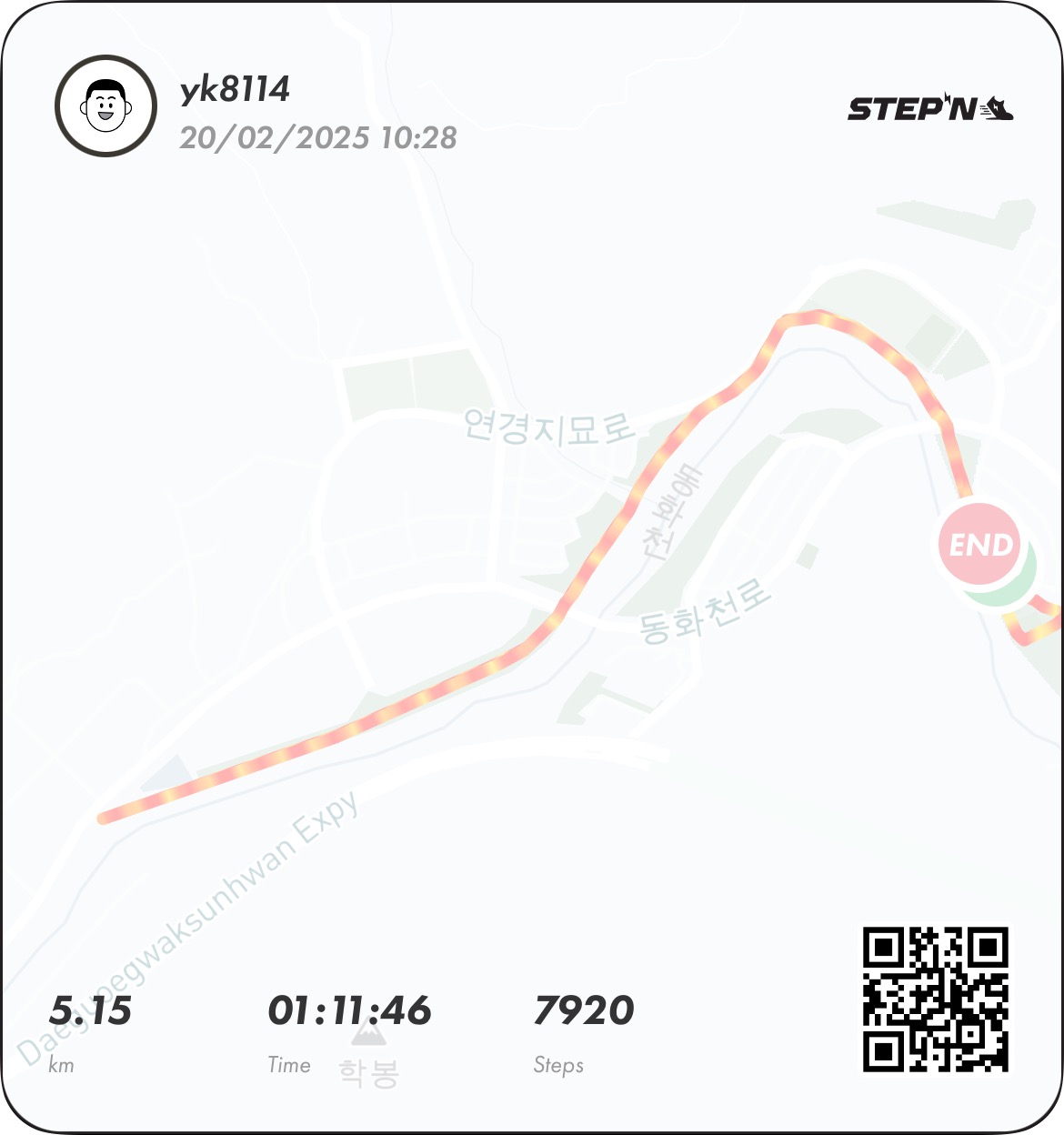 [25/02/20] 건강 투자하자~!! 오운완 5.15km (목표 2km)sjsr (58)in #stepn-kr • last year 봄을 기다린다면 M2E (Move to Earn) 에 참여해 보세요~ 걷기 실으네요 ㅋㅋ #오운완(20250220/5.15/2) #zzan #krsuccess #kr-m2e