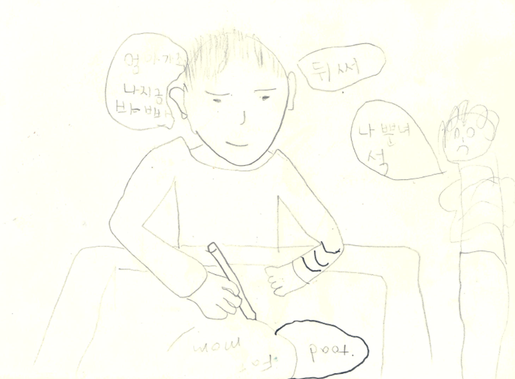 Instead I bought my own sketch book and just went wild. I was hoping that John would pick up and start following me, but instead his eight year old brother started to follow my drawing. He kind of ruined my sketch book with graffiti and scribbling and some bad words in Korean, but he made it funny. My youngest has a hard time with reading and math but he filled my sketch book with creations. I will share one here:
