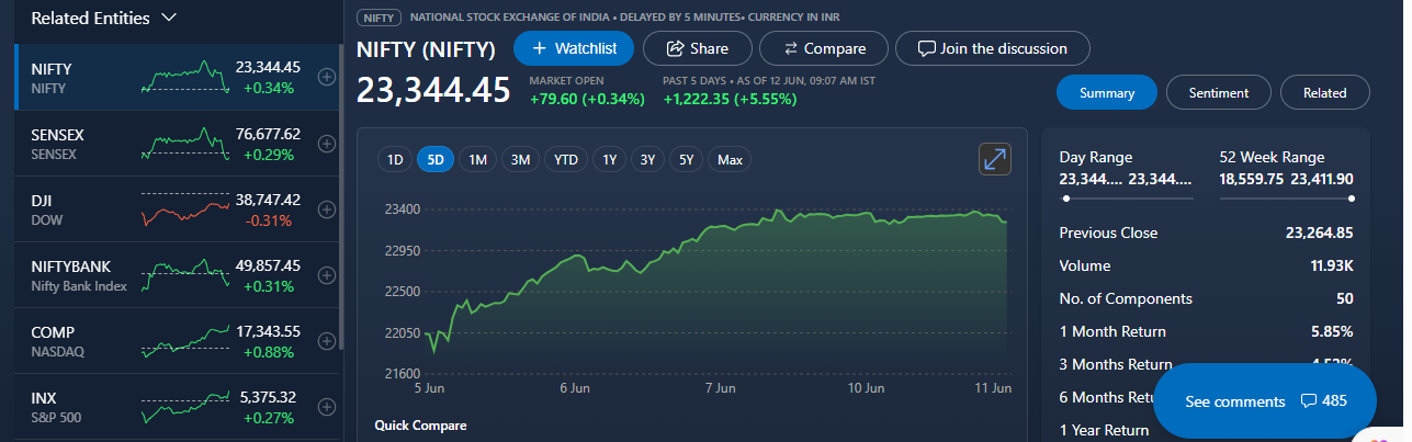 Current Status: The Nifty 50 index is currently at ₹23,370.45, which is an increase of 0.45% from the previous close1.