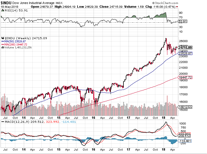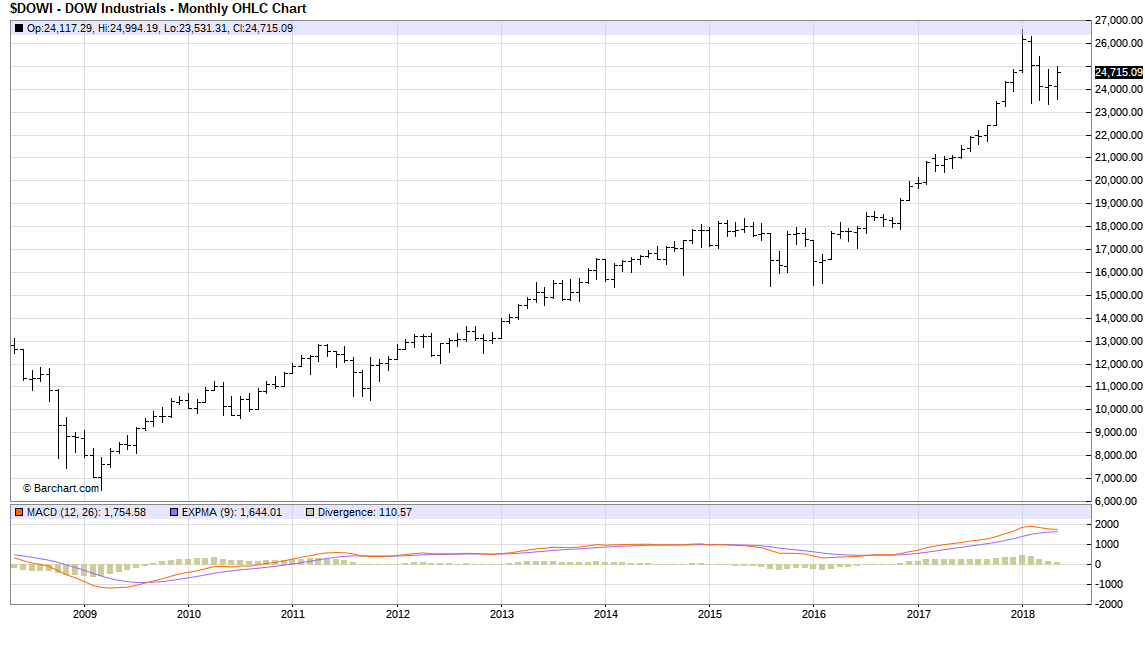 Since the inception of this bull market we have repeatedly stated that until the sentiment turns decidedly bullish and for an extended period, this bull market is unlikely to end. In Jan the bullish sentiment soared past the 60% for the 1st time in years. This could have marked the end of the bull, but the markets let out a massive dose of steam over a very short period and negative sentiment soared. Bullish sentiment has continued to trend downwards from its high of 60 in Jan 2018. Therefore, for now, a crash has to be ruled out, but the markets will continue trending in a wide range until they moved to an oversold state.