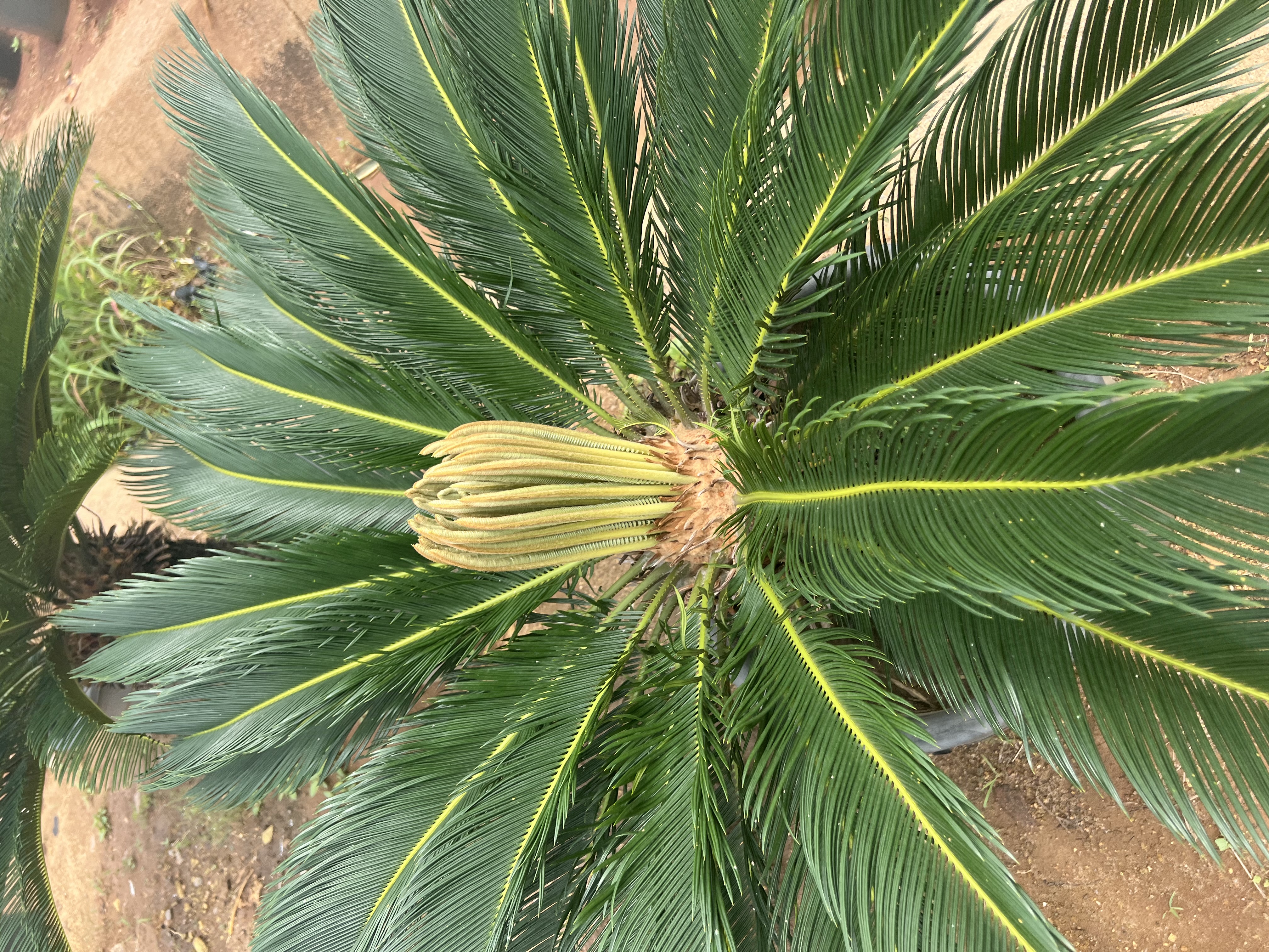 Sago palms are dioecious, meaning there are separate male and female plants. The structure in the center of the plant in the image is likely a female cone-like structure called megasporophylls, where seeds develop. Male plants produce a different, stamen-like cone.