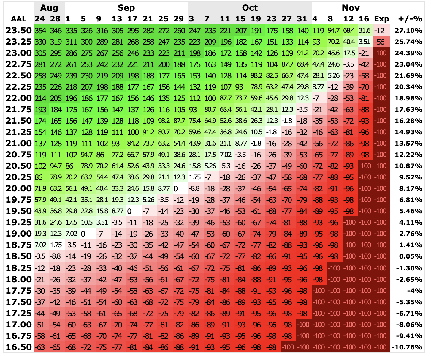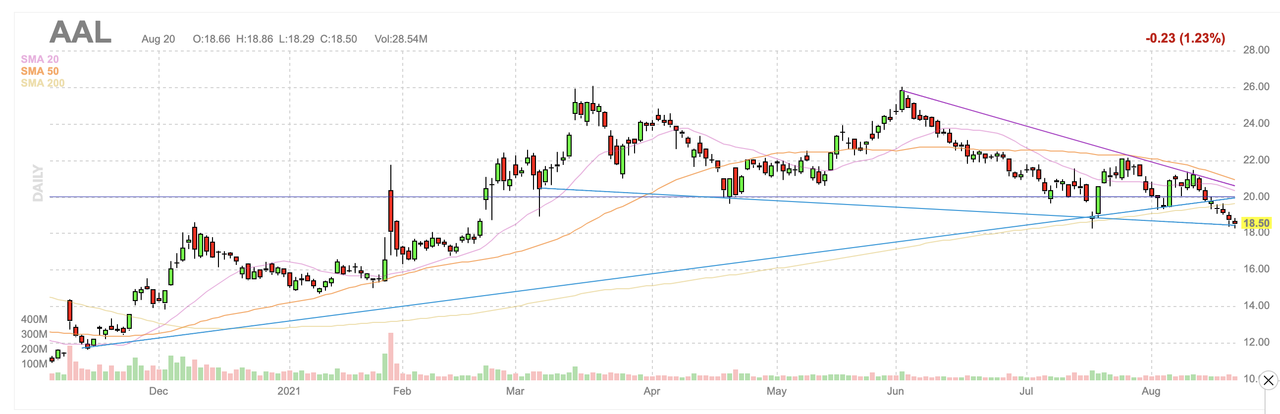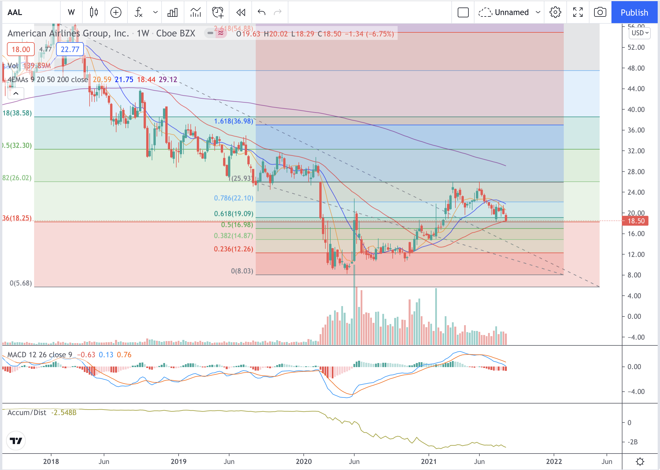 $AAL – Call Options Chart Forecast – 2021-08-21michael14876 (50)in #stocks • 5 years ago $AAL – I like the potential bounce here off the 50ema on the weekly chart. AAL 11/19 $23 Calls around $.57 is what looks good to me. I'm looking for 30-50% gain. Feel free to let me know your thoughts #btc #daytrading #market #charts #money