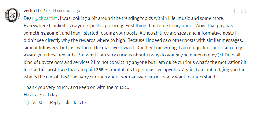 ik heb even de knuppel in het hoenderhok gegooid en hem op de man af gevraagd waarom hij in hemelsnaam 255 SBD betaald om zijn post te upvoten...
