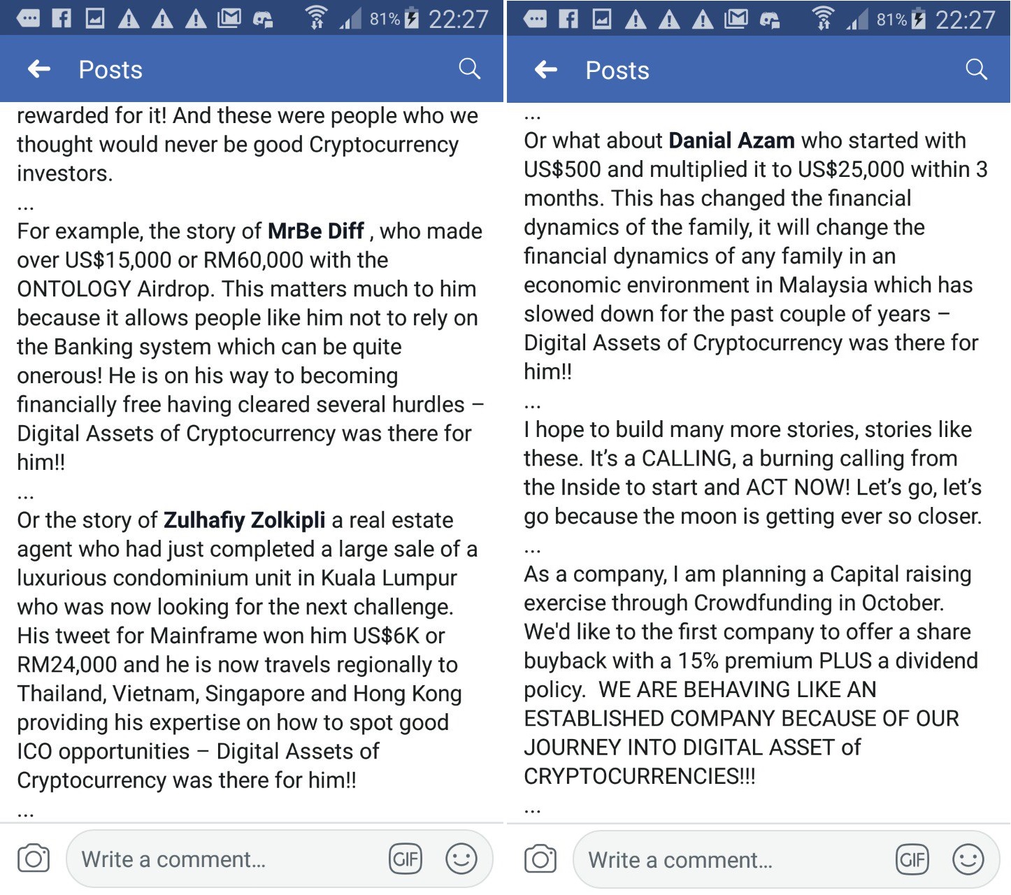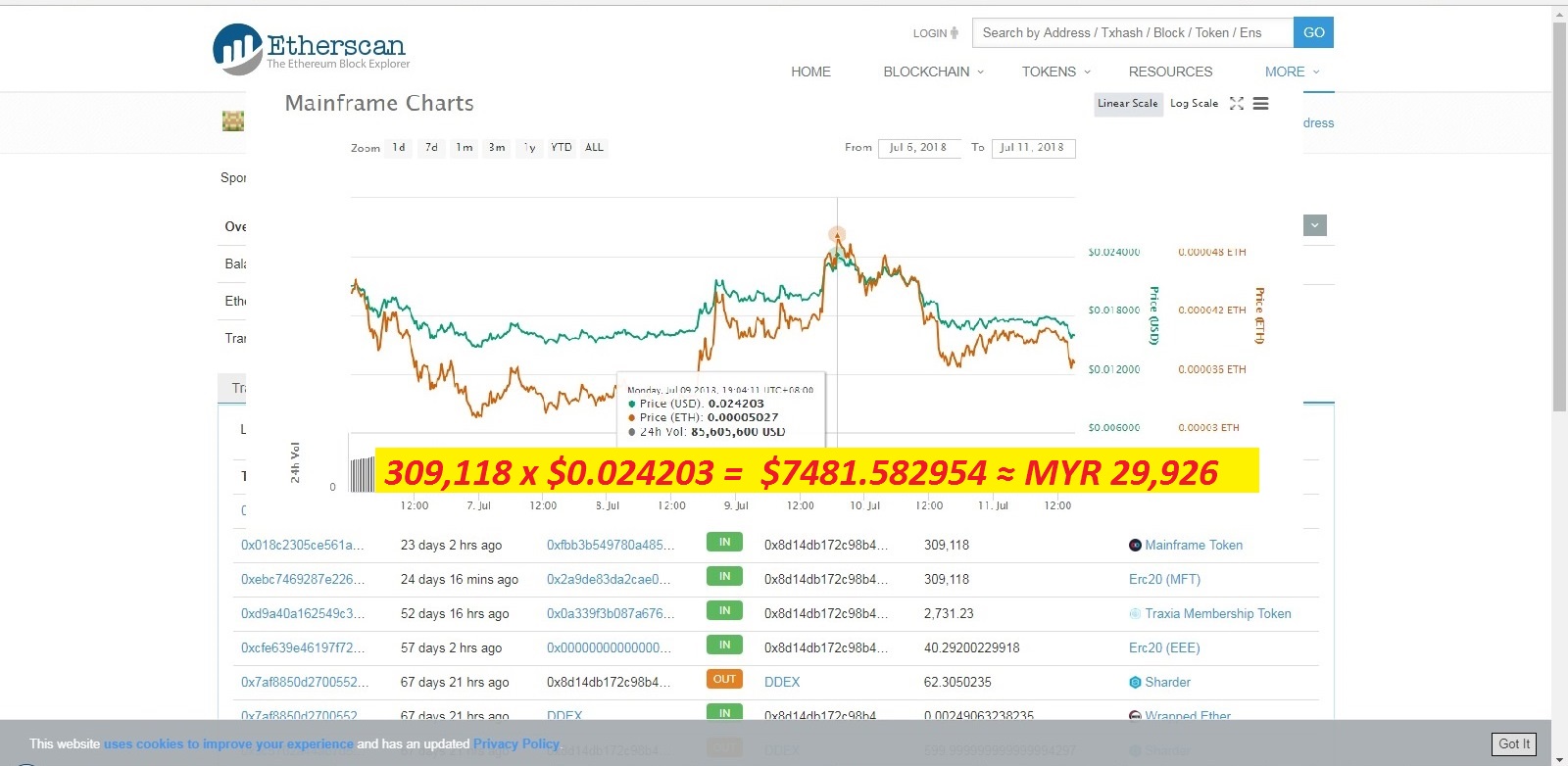“Won Mainframe tokens worth USD $7,400 (MYR29,926) when token value, $0.024 (ATH) with no capital investment