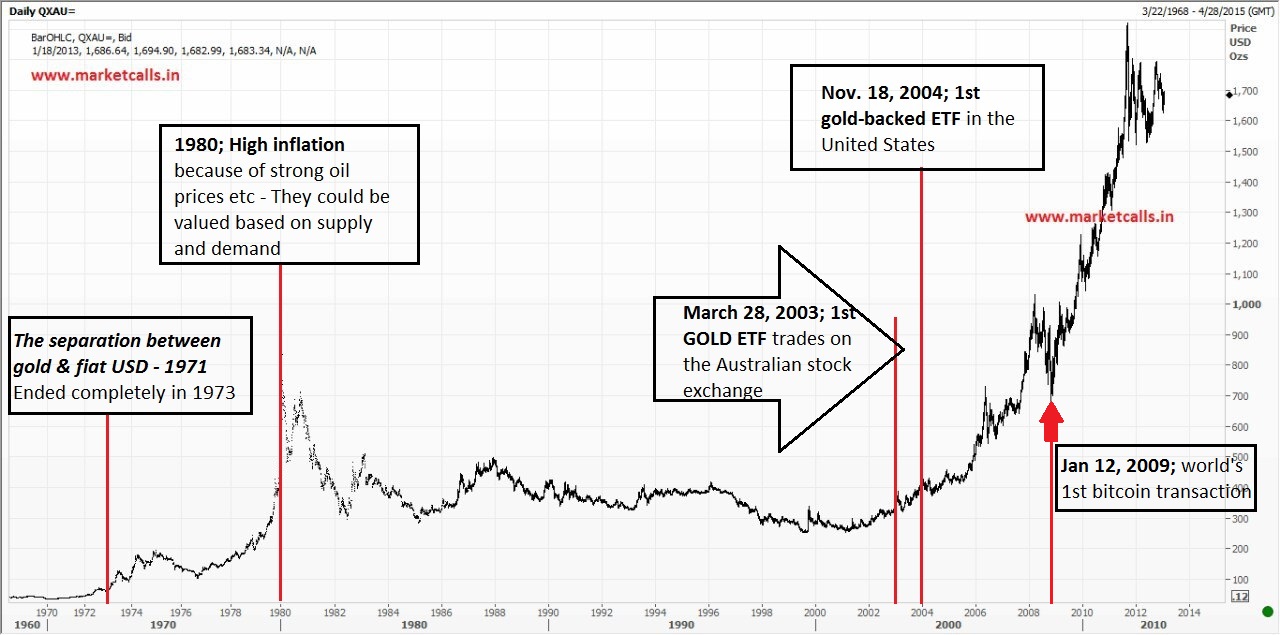 Gold vs USD - 50 years chartThe history of bartering dates all the way back to 6000 BC and it’s sustained until the revolution on the currency changing to use dinar’s back in 696AD. Because of the “cunning individual” see the chances for themselves, fiat paper was created, back in 1000 AD. The first recorded use of paper currency is in China. From then, fiat money continue to evolve until the use of gold as the standard., The U.S. currency backed by the federal gold reserve, ended in 1973 when the United States also stop swapping gold to foreign governments in exchange for U.S. currency notes.