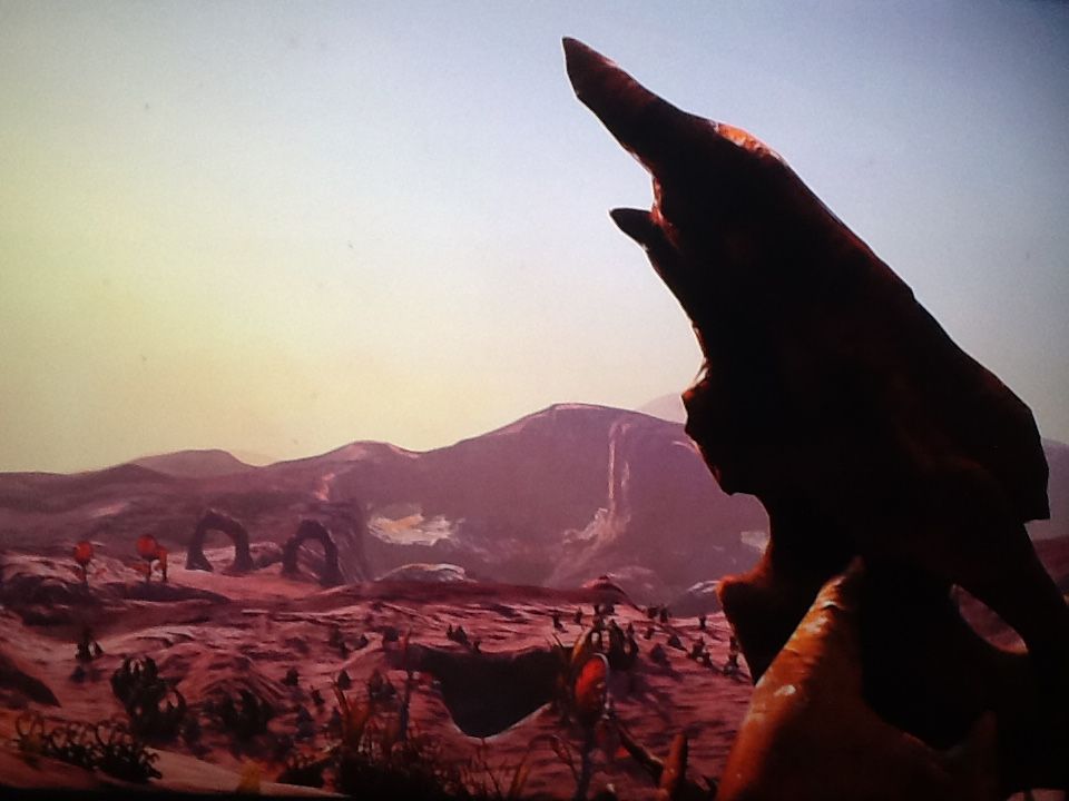 I landed my craft on one of the islands, and opened the hatch. Apart from the wind, there was complete silence. There were some signs of life; a few hardy plants clung bravely to the red rocks carved into twisted shapes by the eroding forces of the ceaseless wind, but the quiet was so total I felt little confidence in finding animal life in this area. I decided to move on.