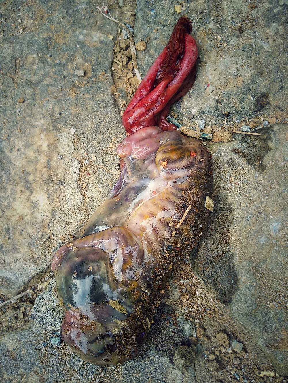 But, then, I decided not to disturb her and let her handle the process on her own. When she got finished, I approached her carefully.. and saw a baby cat enclosed in the amniotic membrane & lying on the ground.