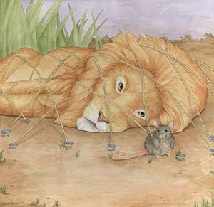 Remembering the kindness of the lion, the mouse helped release the lion by gnawing on the net until it broke. The lion was free. Since then, the Lion and the Rat have become good friends.