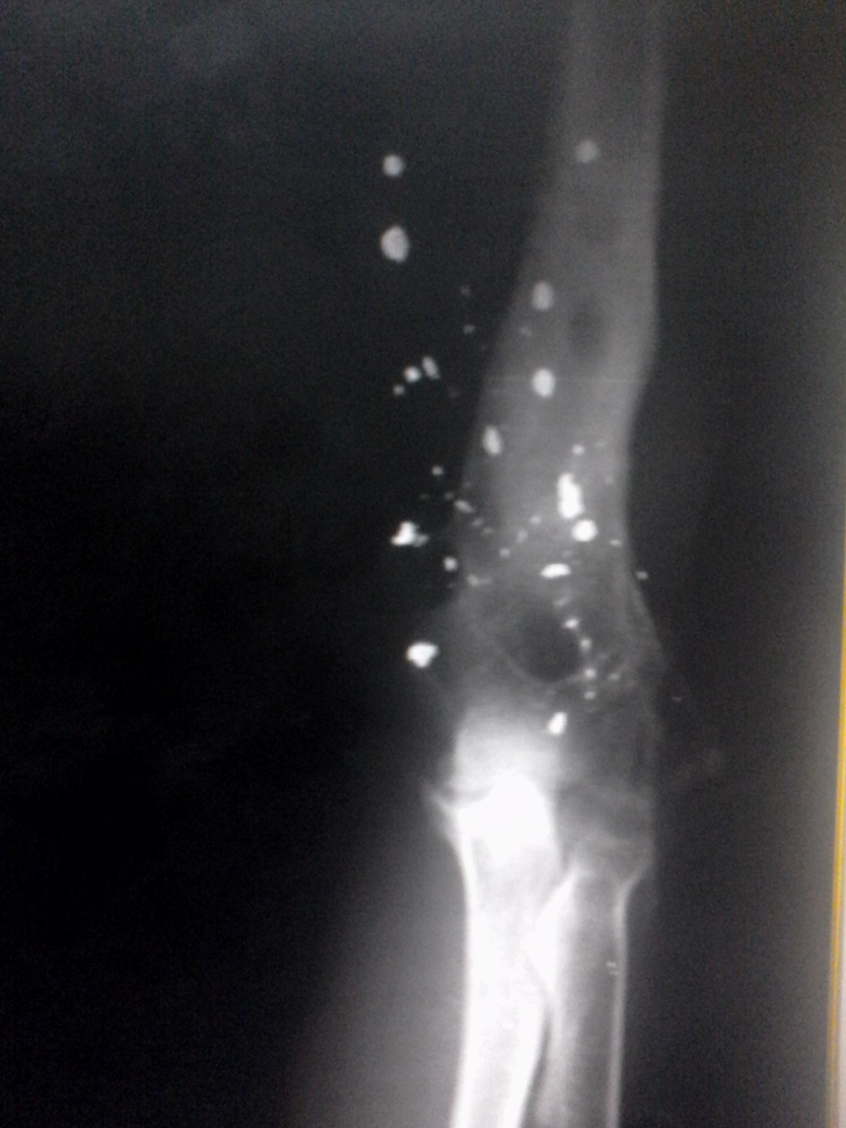 En las siguientes imágenes pueden observarse un par de estudios que fueron realizados a un paciente masculino de aproximadamente 40 años de edad, el cual acude a la sala de rx del Hospital Central Dr Placido D Rodriguez con el fin de realizarse un rx de codo en dos proyecciones. El estudio fue remitido al paciente para un control anual luego de haber sufrido un grave accidente.