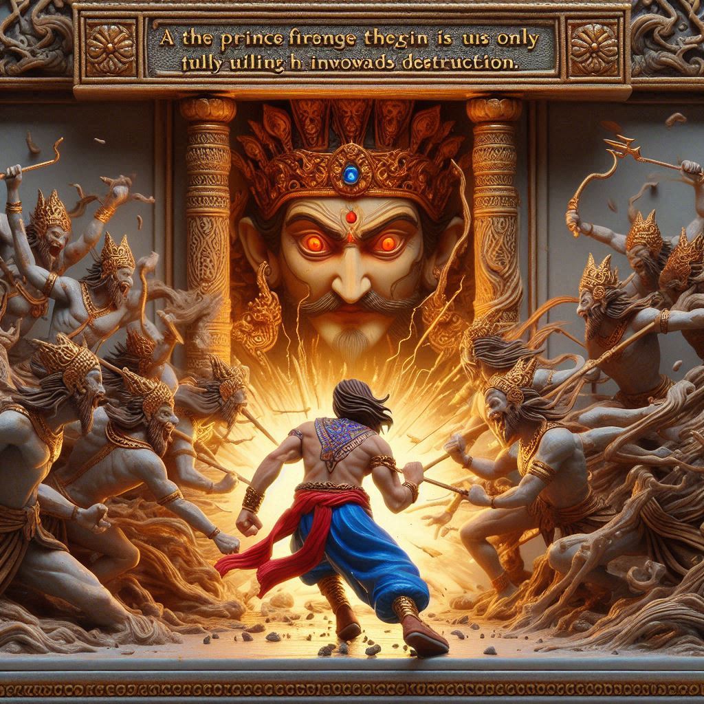 এই সময় রাজকুমার অনুভব করলেন, তার ভেতরের শক্তি তাকে কেবলই ধ্বংসের দিকে টানছে। তার মনে হলো, মূর্তিগুলো আসলে তার নিজের ভেতরের অন্ধকারের প্রতিচ্ছবি। তিনি বুঝলেন, যদি এই শক্তিকে তিনি নিয়ন্ত্রণ করতে না পারেন, তবে তার পরাজয় নিশ্চিত। রাজকুমার সমস্ত শক্তি নিয়ে সেই মূর্তিগুলোর দিকে এগিয়ে গেলেন এবং একের পর এক মূর্তিকে পরাজিত করতে লাগলেন।