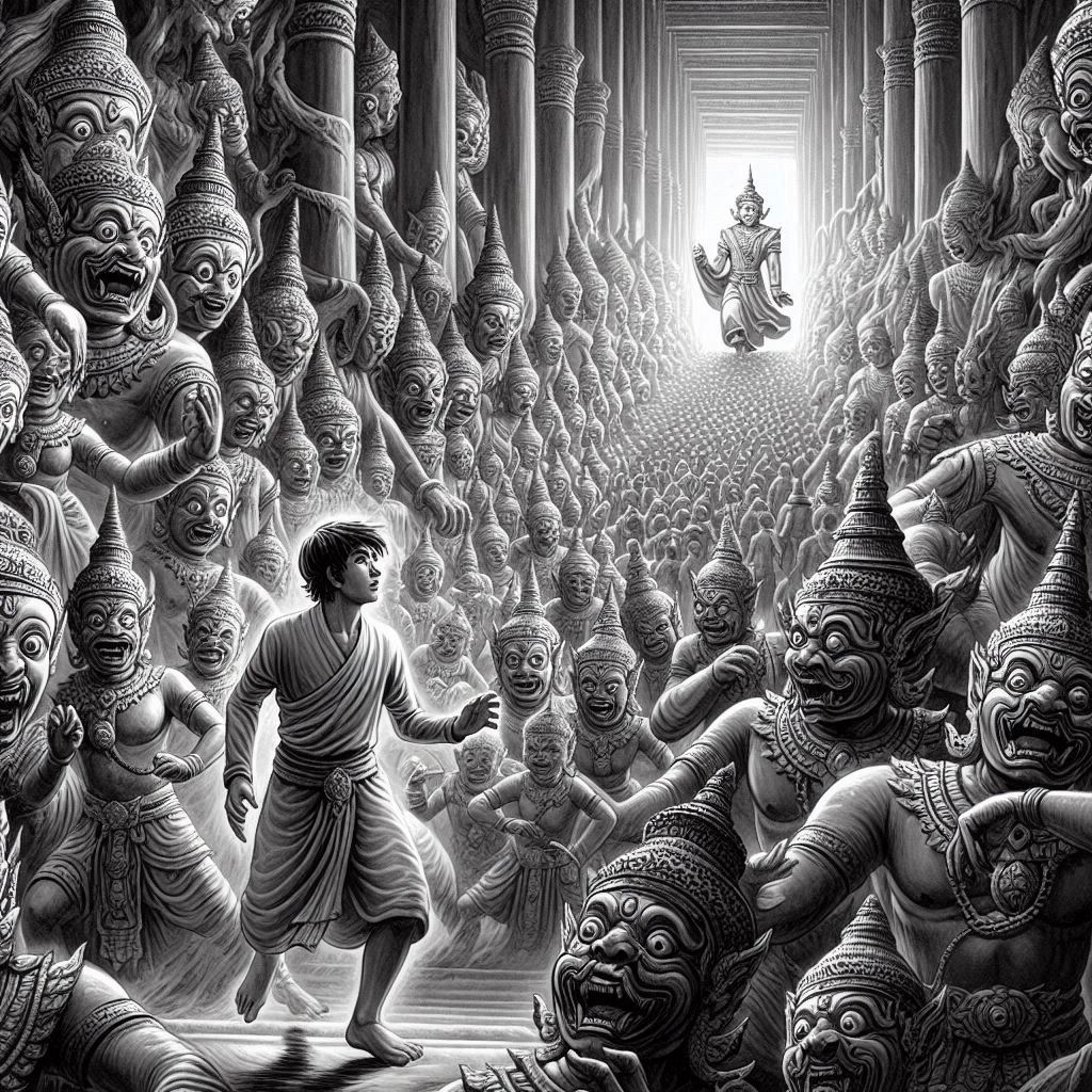 মন্দিরের ভেতরে প্রবেশ করার পর রাজকুমার দেখতে পেলেন এক বিশাল হলঘর, যার চারপাশে অজস্র মূর্তি দাঁড়িয়ে আছে। মূর্তিগুলো দেখতে যেন জীবন্ত, তাদের চোখে আছে এক ধরনের অশুভ দৃষ্টি। রাজকুমার মূর্তিগুলোর দিকে তাকাতেই তারা নড়াচড়া করতে শুরু করলো। যেন মূর্তিগুলো তার দিকে ধেয়ে আসছে।