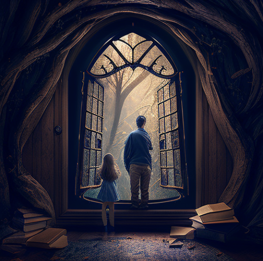 As they opened the drapes to the magic room window, they found themselves standing at the edge of a dense forest. The trees were tall and green, with leaves that shimmered in the sunlight. They could hear birds singing and the sound of a nearby river.