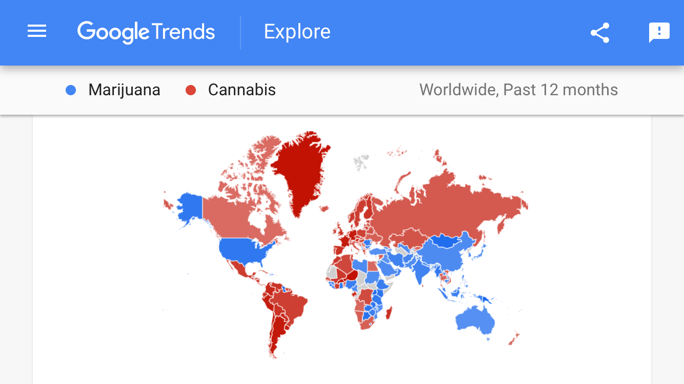 This got me curious into looking through Google Trends and seeing which words Cannabis or Marijuana were searched more frequently in countries around the world. In other words, what word dominates in each country. This was generated.