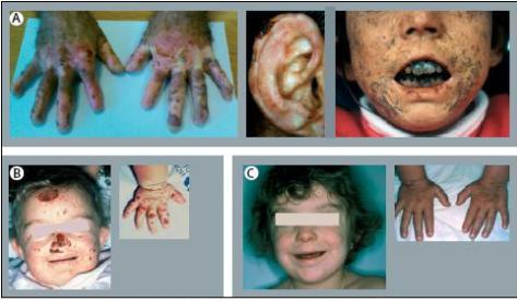 CEP skin lesions (Gunther's disease): A) severe presentation in adults; B) severe presentation in a newborn before; and C) 2 years after bone marrow transplantation with persistence of erythrodontia. (From Puy H, Gouya L, Deyback J-C. Porphyrias. Lancet 2010;375:924-37.)