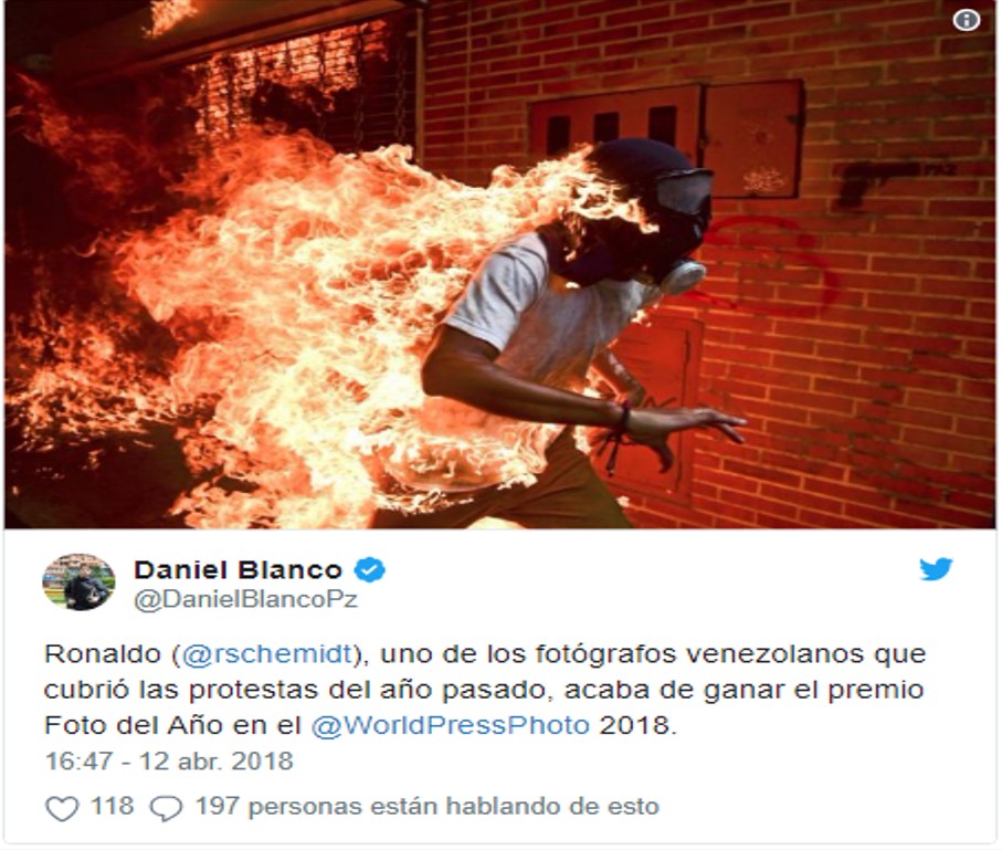 Ronaldo Schemidt, autor de la gráfica, recibió el reconocimiento por la fotografía titulada "Crisis en Venezuela" ,El fotógrafo venezolano Ronaldo Schemidt ganó el 12 de Abril de 2018, el premio a Mejor Foto del Año otorgado por World Press Photo con una imagen de las protestas en Venezuela durante el 2017