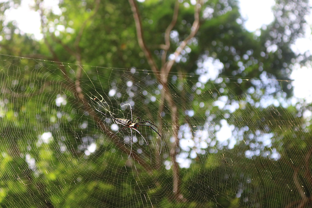 So when he saddled the horse she hopped on to it and they rode a narrow and stony path down to the ocean. Giant spiders hang in huge webs from the branches near their heads and the timeworn stones of the path were slippery and wet. Takato had ordered a sailboat a few days earlier to pick him up at the coconut beach near the southern tip of the island.