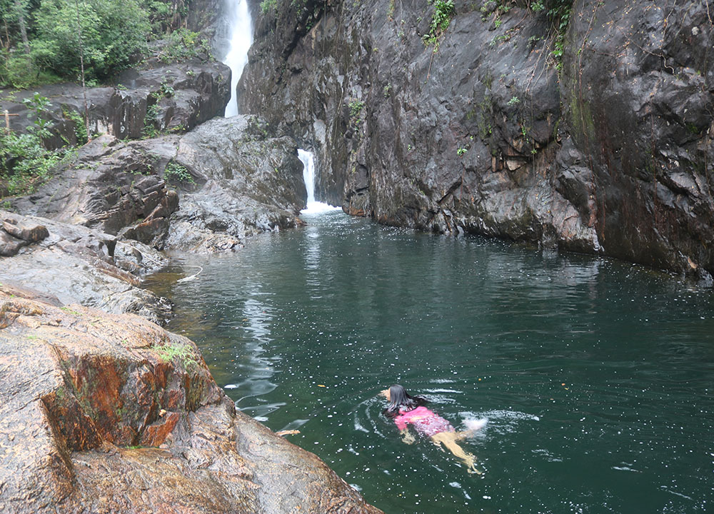 Nasara, the daughter of the elephants islands king, fled from her much older husband. He wanted her to stay in the house all day. She longed for the sunlight and the wild and juicy nature of her island. She ran through the thick jungle and before she knew it, she fell down a cliff and landed in a pond. It was a beautiful pond, with a giant waterfall on one side, leading into a second, smaller waterfall.