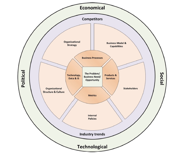The problem/need/opportunity that the analyst is analyzing exists within an immediate context. At this level, there are technologies/information systems, business processes, data, and resources that are used in the current state. It is within this immediate context that the problems occur. However, these aspects exist within another context, that of the organization. The organization will have certain organizational strategies, business model, stakeholders, internal policies, and organizational structures and culture that in various degrees influence the immediate context of the issue being investigated. The organization itself exists within the context of its competitors and trends in their industry. Likewise, the competitors all operate within the context of their environment influenced by political, economic, social, technological influences and changes. Therefore, the external and the internal context, within which the problem or the needs exist, can have an influence on which alternative is the “best” or the “right” solution. As such, it is important to know the context within which a problem is to be solved. If an analyst is an employee of the company, they are probably aware of the business context. If that is not the case, it is helpful to understand the context by analyzing the business model of the company and the strategy they employ to gain or maintain their competitive advantage.