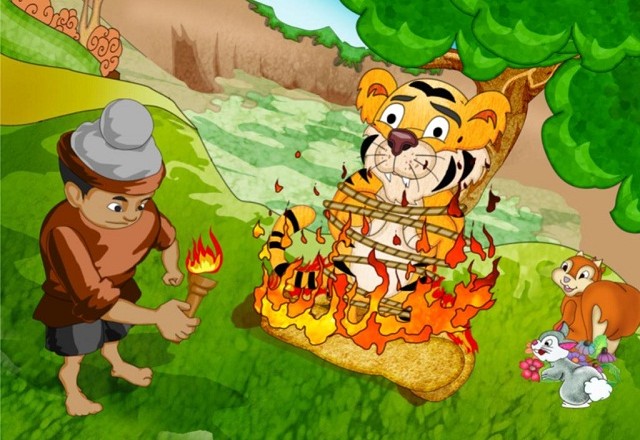 The tiger agreed, the farmer then tied the tiger tightly with a rope to a tree. Then he took straw and piled it around Tiger, lit it on fire and shouted: