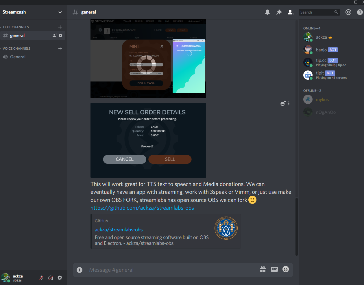 I hope to get to work with @3speak and @vimm.tv because with @vimm https://Vimm.tv we can already live stream and get paid in Steem and steem engine tokens like Vimm GEMS and using a few tricks like having a discord bot and using existing tip bots like @tipitbot or even the incredible steem engine tip bot @banjo by @inertia . We could quite easily allow banjo for example to be triggered by a certain amount of tip to read TTS messages from the tip in voice chat, and to play youtube video links music in the voice chat as well, with a memo of text to have TTS text to speed read (TTS is built into discord) and we can have media donations where a youtube link is the memo for the tip by simply raising a little steem to pay a developer like inertia or someone at @tipit to add this feature ( @inertia would have to add memos to @banjo tips and also withdraws while he's at it :D ) I have tried reaching out to both groups and I hope we can have a new feature on either of these bots to allow Voice Chat TTS and Media Tips with a threshold you can set, so i can make it so 10 steemp tip sent to me is needed to have @banjo play my message as a TTS text to speech robot voice message in voice chat, or to play my youtube links as songs in the voice chat. I can then have a stream on and have discord on with a private voice room and another waiting room.
