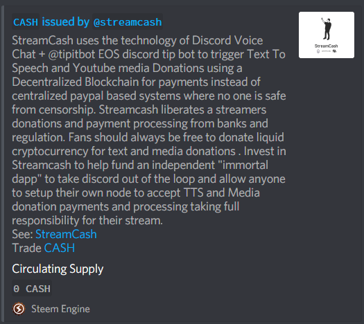 StreamCash uses the technology of Discord Voice Chat + @tipitbot EOS discord tip bot to trigger Text To Speech and Youtube media Donations using a Decentralized Blockchain for payments instead of centralized paypal based systems where no one is safe from censorship. Streamcash liberates a streamers donations and payment processing from banks and regulation. Fans should always be free to donate liquid cryptocurrency for text and media donations . Invest in Streamcash to help fund an independent "immortal dapp" to take discord out of the loop and allow anyone to setup their own node to accept TTS and Media donation payments and processing taking full responsibility for their stream.