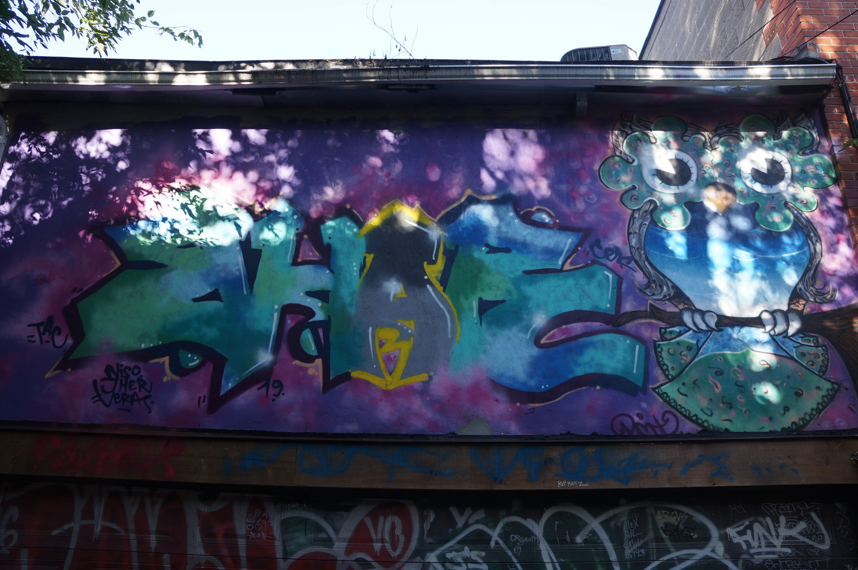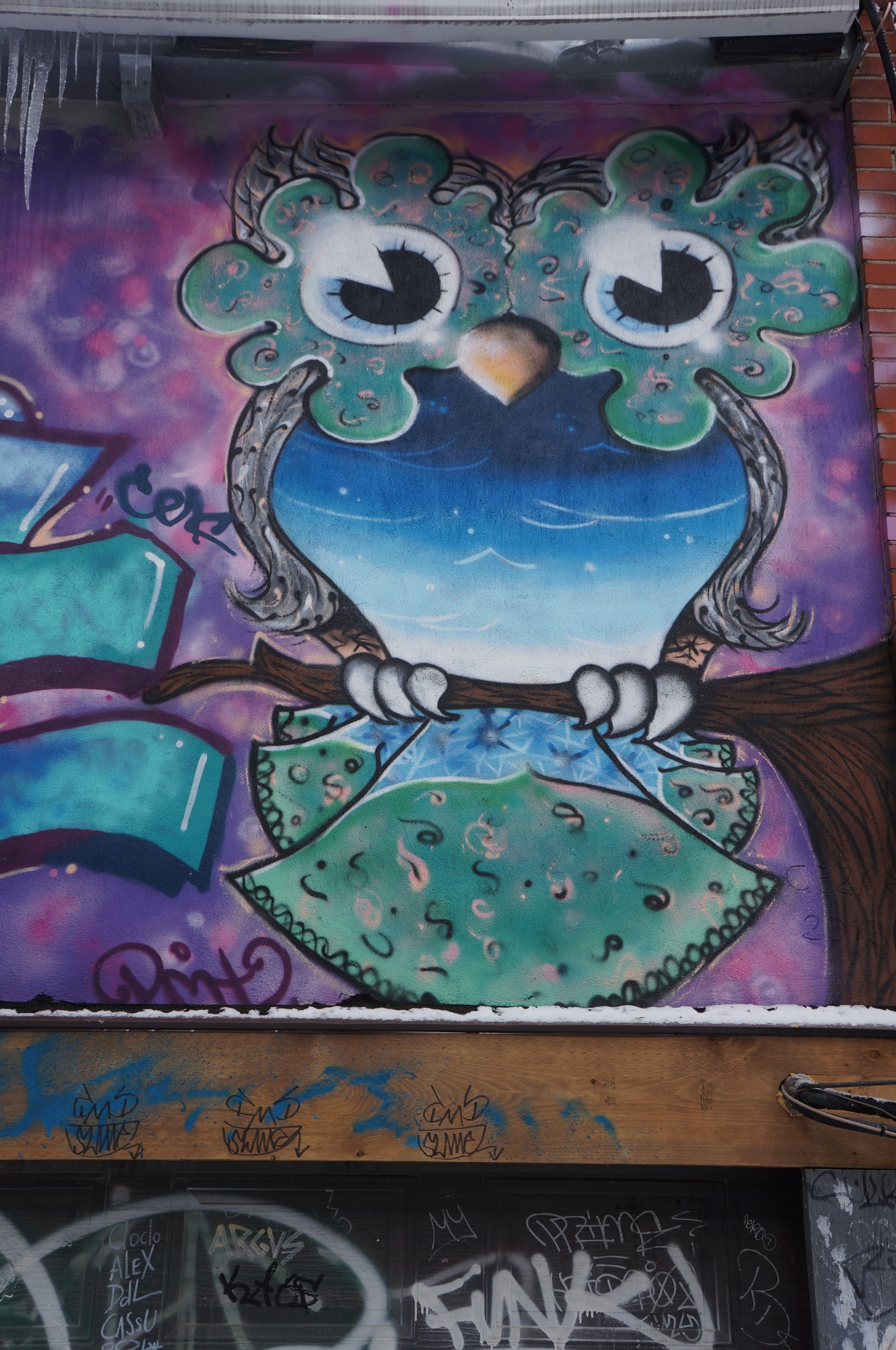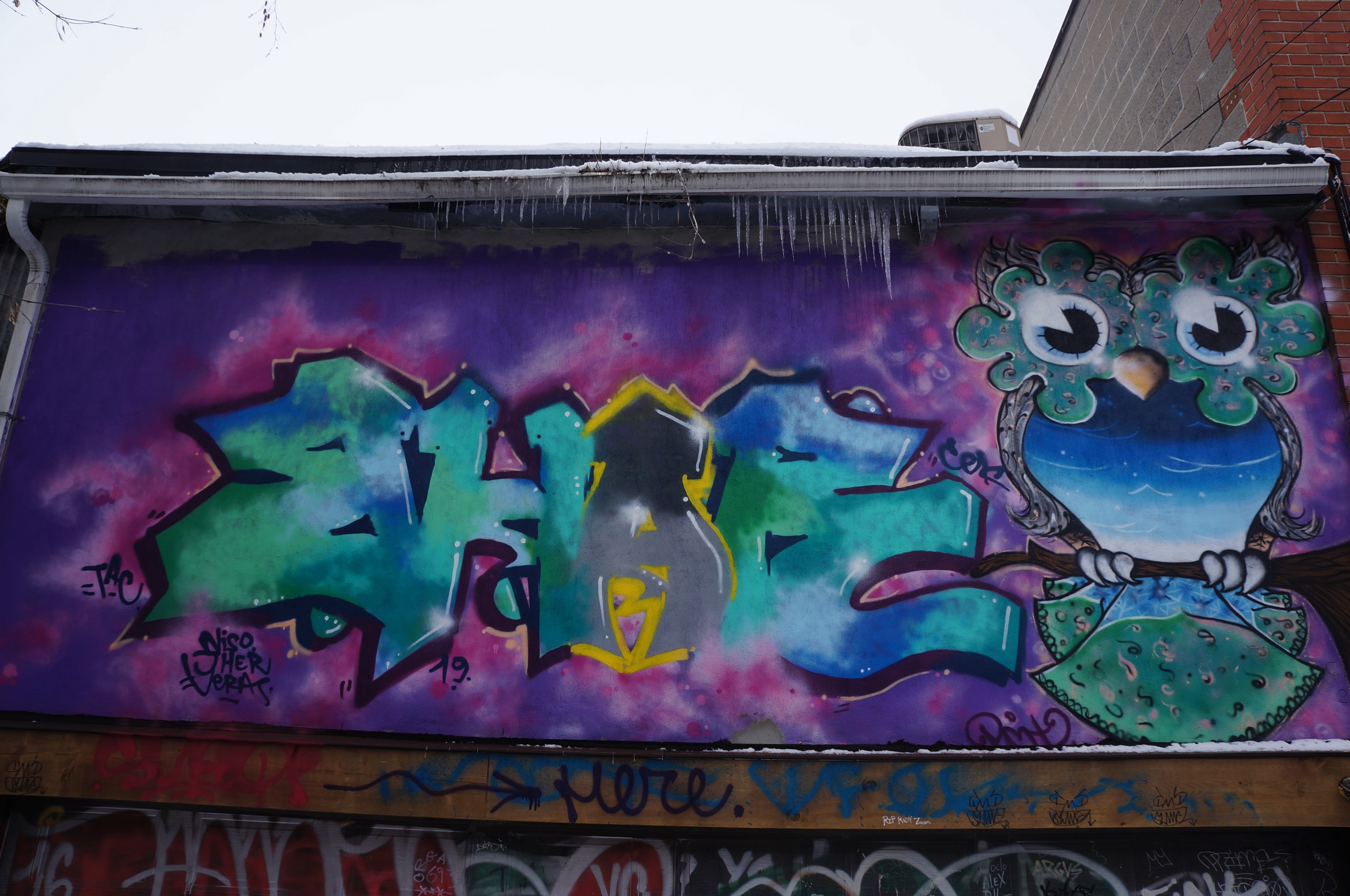 Diemti aka IMVGINVTI (on Instagram) is a street artist based in Montreal. He draws these owls that you can find everywhere in Montreal.
