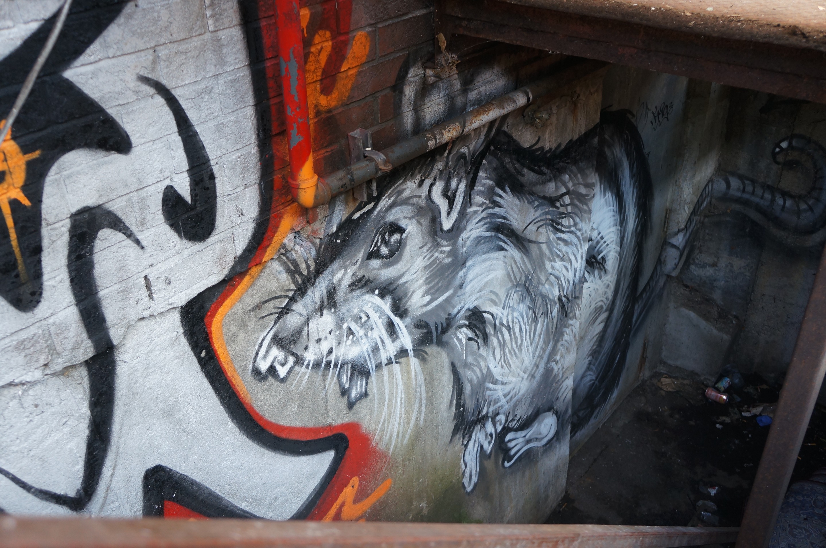Right next to it, a staircase descending into a basement, a huge rat (artist unknown) ... I like the contrast between these two works.
