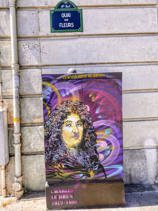 Paris - Ile Saint-Louis - Quai aux Fleurs. Work of C215 "Le Grand siècle du Marais". Charles Le Brun: 17th century painter and decorator