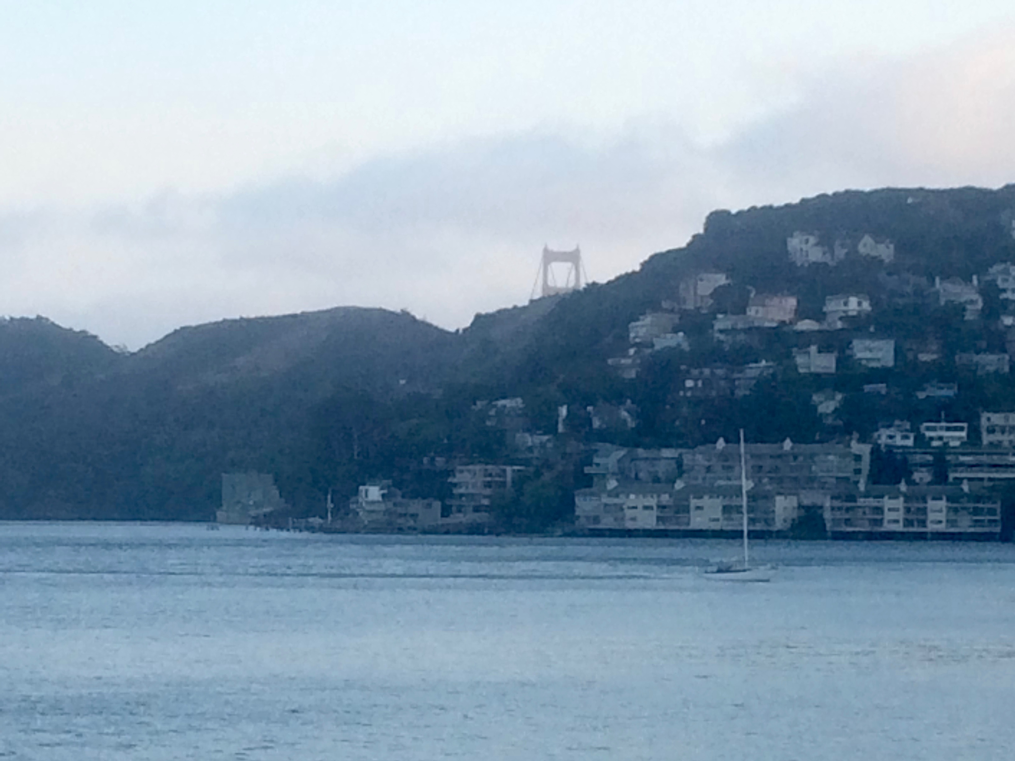 Golden Gate Bridge peaking over Marin headlands above Sausalito.