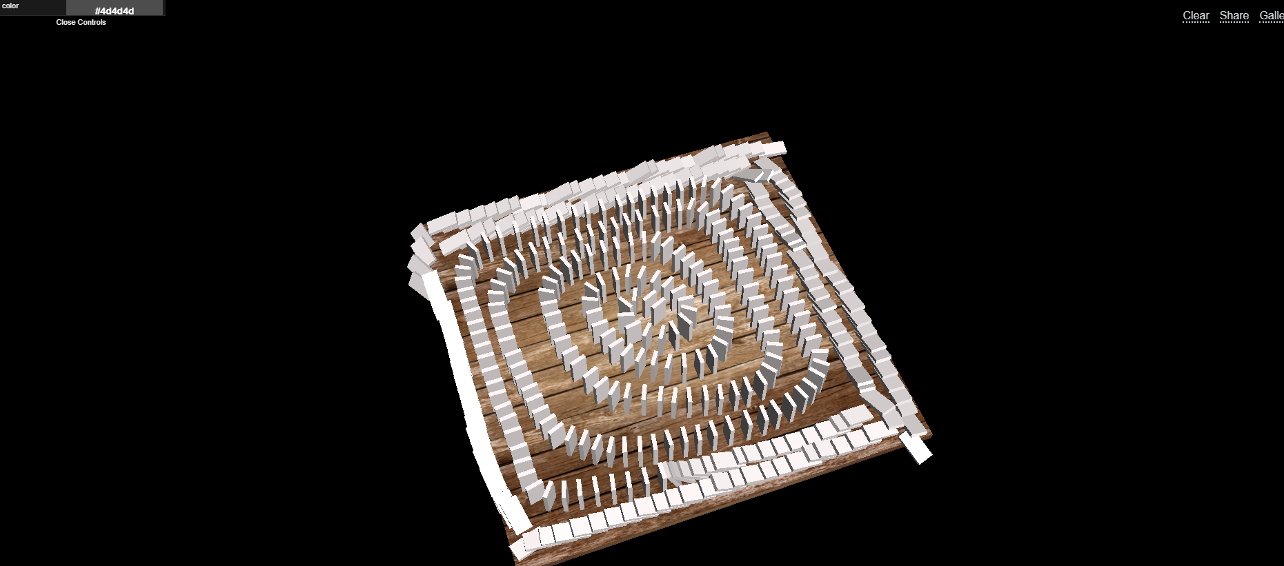 Krótka instrukcja - lewym przyciskiem obracasz "arenę" lub przemieszczasz kostki domina. Prawym przyciskiem (można przytrzymać) stawiamy kostki. Klikając na kostkę domina prawym przyciskiem popychamy ją. Przyciskiem "c" czyścimy planszę z domina.