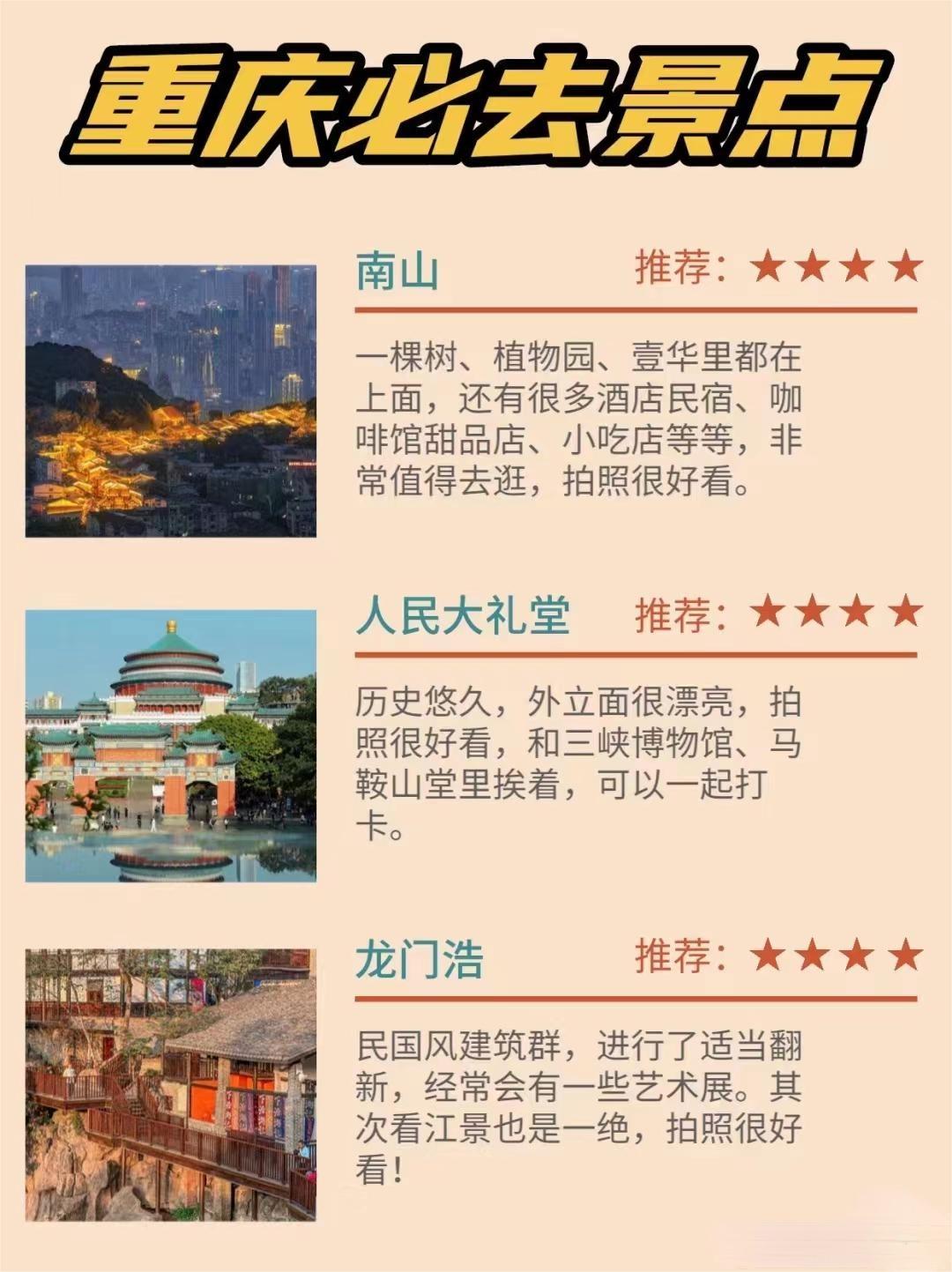 - 南山:重庆南部的一座山,可以俯瞰整个城市的美景,值得一去。