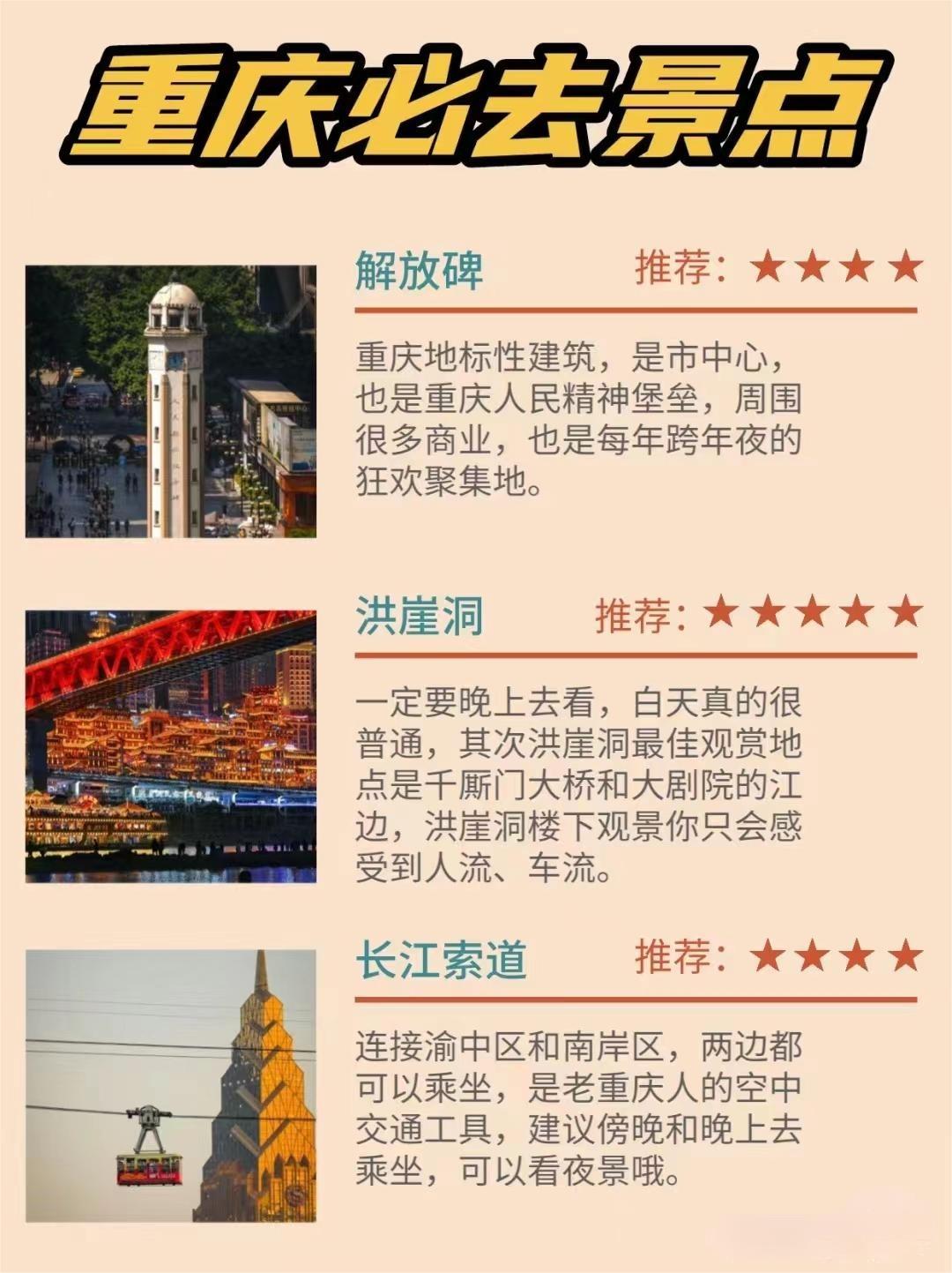 - 解放碑:重庆的地标之一,四周高楼林立,既是商业中心,也是历史纪念地。
