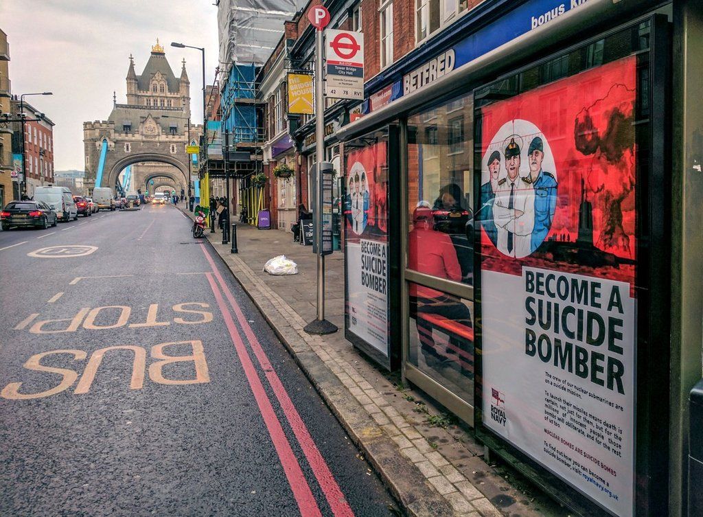 On first glance the posters appear to be unusually-worded recruitment advertisements for the Royal Navy; they feature the naval force's branding, and the text directs people to the website royalnavy.org.uk for information about joining the crew of a nuclear submarine.“The crew of our nuclear submarines are on a suicide mission," the posters claims. "To launch their missiles means death is certain, not just for them, but for the millions of innocent people those bombs will obliterate, and for the rest of us too.”The spoof posters, installed by a 'subverting organisation' known as Special Patrol Group, were designed by British artist Darren Cullen, who’s work has previously featured at Banksy’s Dismaland exhibition and at the Victoria and Albert Museum.