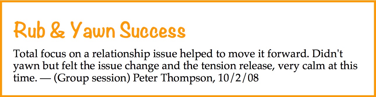 Find a hot topic that will discharge right now. Start visualizing and rubbing and yawning. Intensely. Continue the three parts of Rub & Yawn on that topic until it won’t discharge any more right now. You should feel calm and expansive. That’s all for now. It might take 10-25 minutes if you have been working hard on a really hot topic.