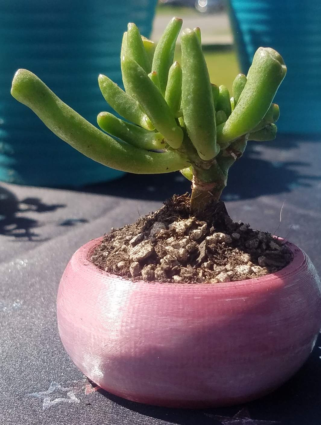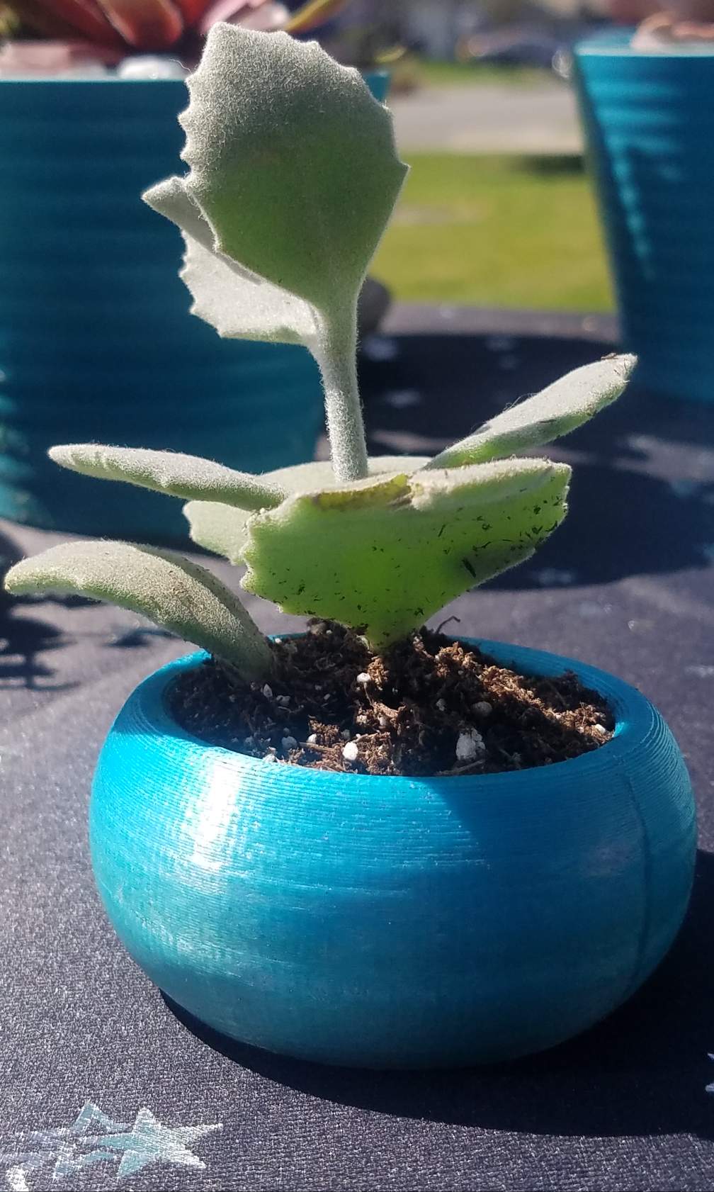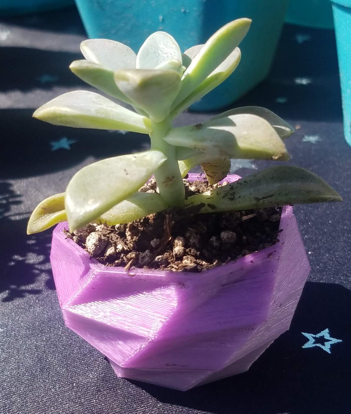 Oh! This one's cool. It's called a ghost plant and I 3d printed the planter in plastic that changes color in the sun. It's white until sun hits it and then turns purple!