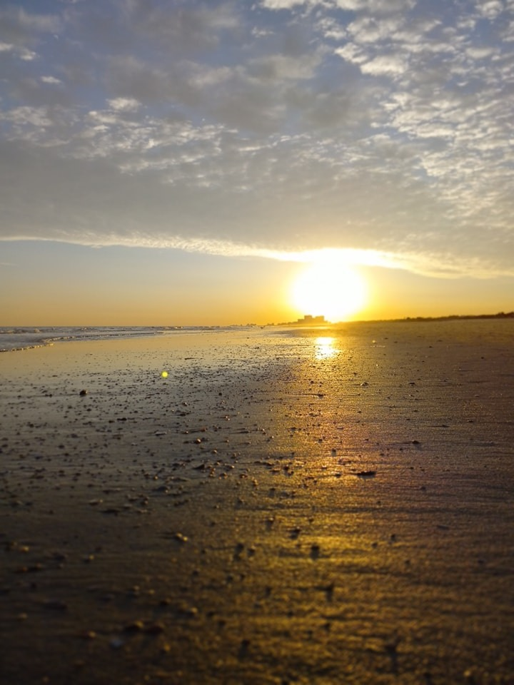 The waves embrace the sunlight, creating a dance of reflections on the water's surface. As the first light appears, it brings a sense of calm and hope. The beach, once quiet, comes alive with the soothing sounds of nature. It's a magical moment that fills my heart with joy and gratitude. Each sunrise is a reminder of new beginnings and the beauty that exists in simple moments.