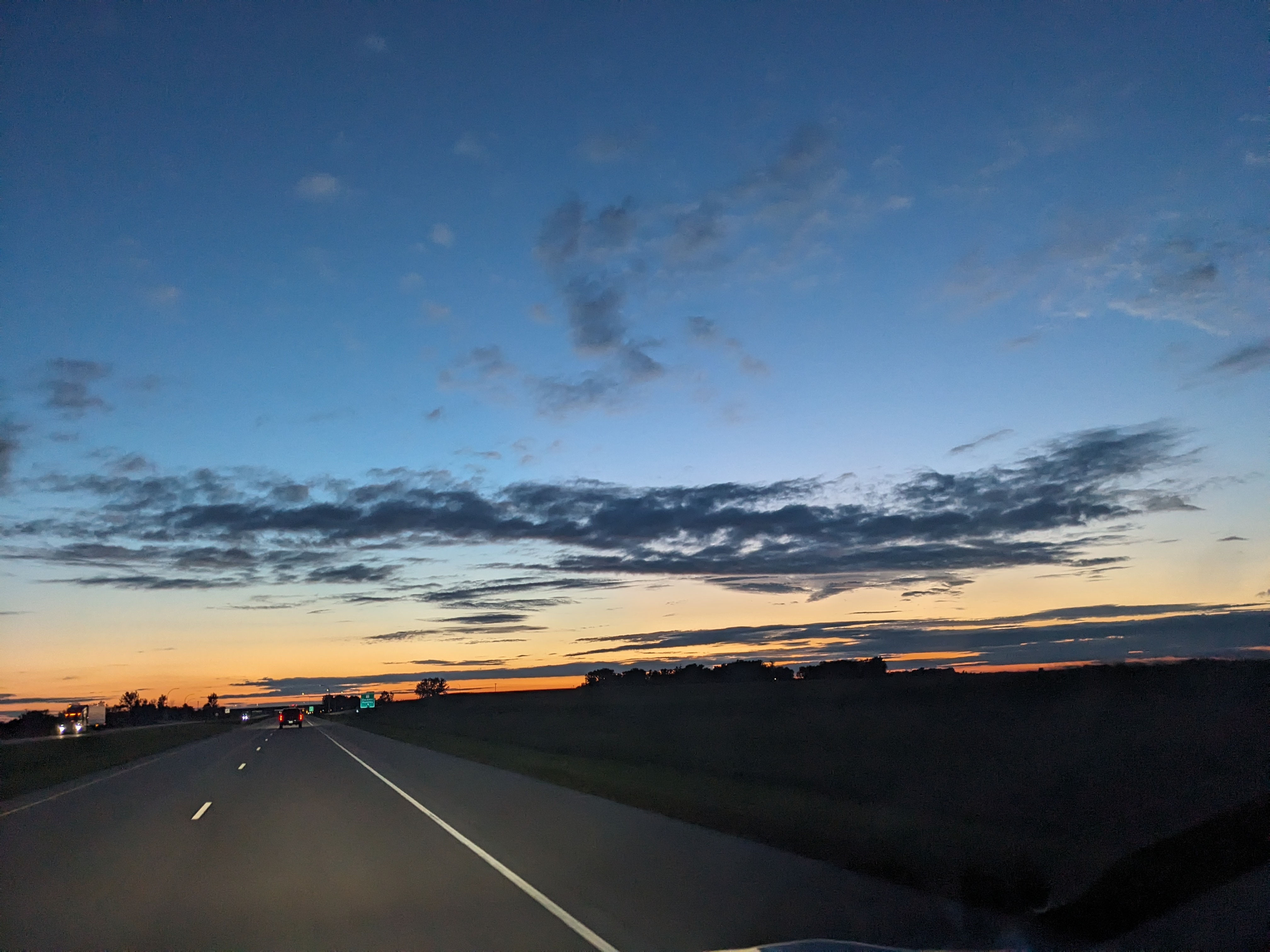 This was the best part of the sunset we saw in any of our days driving. Really got some pretty colors in the sky really got to see me blues and the purples and the oranges come through is just with just about to set he still had to drive a little ways but may have to get there with the ground before they got too late. I think we got to the hotel just before 11:00 pm.