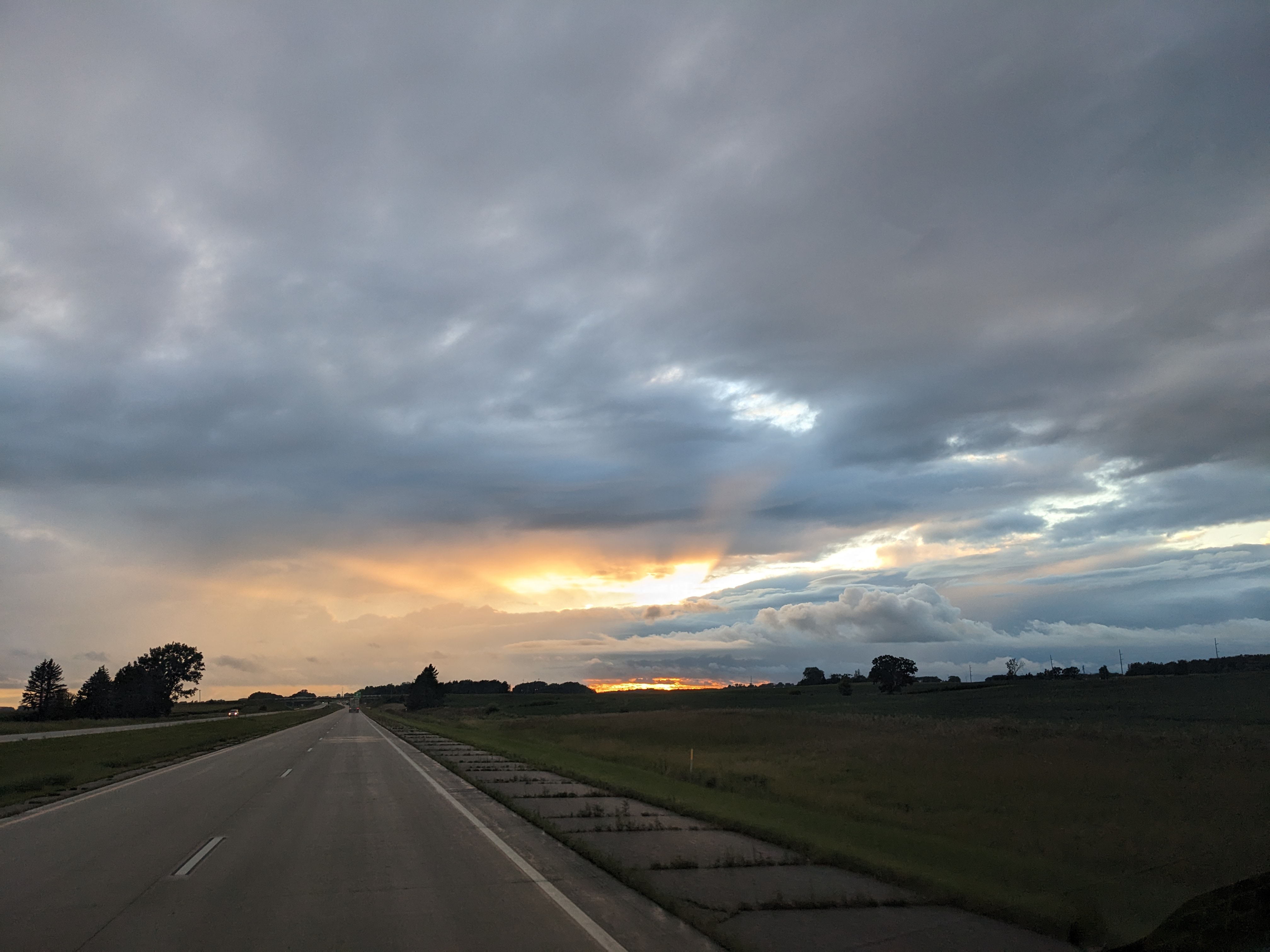 We started a road trip out west to the Tetons and Yellowstone on a Friday night. The weather wasn't great but we did get to see a very pretty sunset as we kept chasing it to the West. Pretty to watch and nice that we got a very extended.sunset driving 70mph down I-90