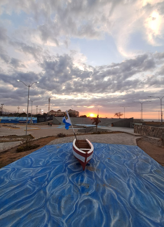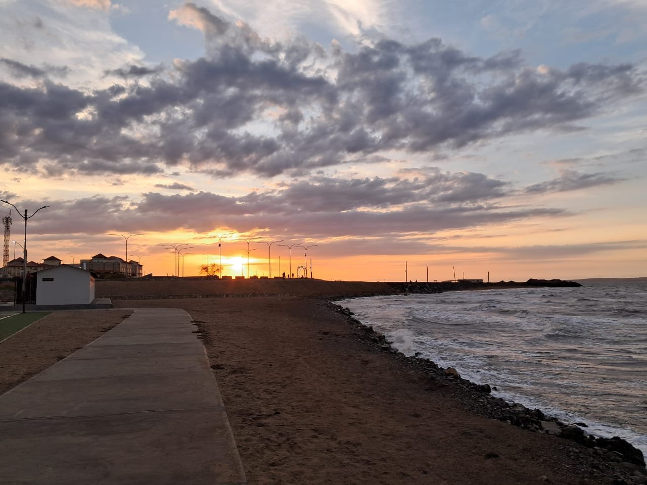 When we arrived at the boulevard, the sun was already setting, and I quickly took out my phone to snap some pictures. In one of them, you can see the beach, the concrete walkway, and in the background, part of the shopping center and the amphitheater.