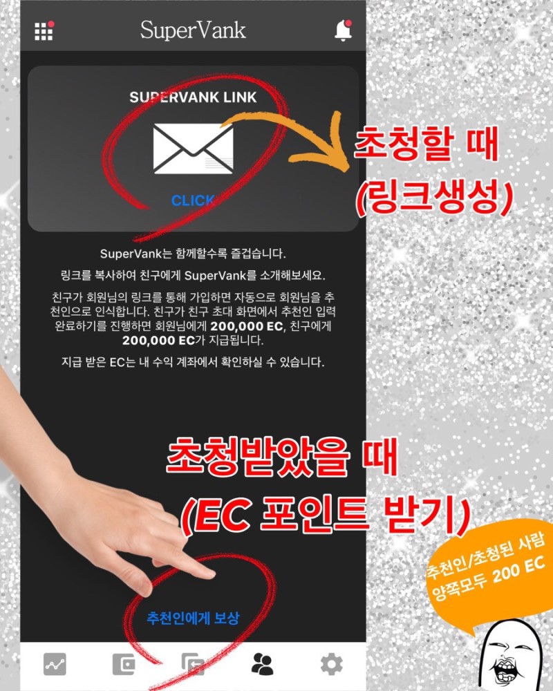 이 앱도 마찬가지예요. 친구초대 메뉴로 들어가 초청링크가 복사되고 이 링크로 SuperVank 가입한 사람이 다시 [추천인에게 보상]을 누르게 되면 두 사람 모두 200,000 EC를 얻습니다. 시작할 때 반드시 받아야 하는 큰 머니죠.