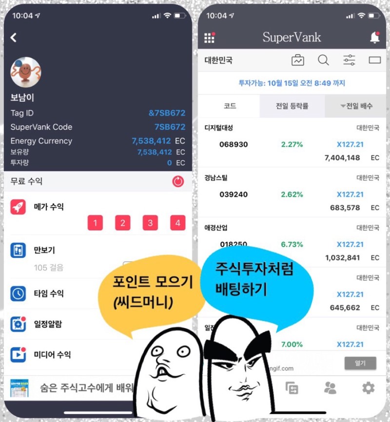 슈퍼뱅크(SuperVank)는 광고를 보거나 만보기/명언 등을 보며 획득한 포인트(EC)를 주식시장에 다시 투자(배팅)함으로서 투자수익을 몇 배에서 몇 천 배까지 배가시킬 수 있는 새로운 방식의 앱테크 앱입니다.