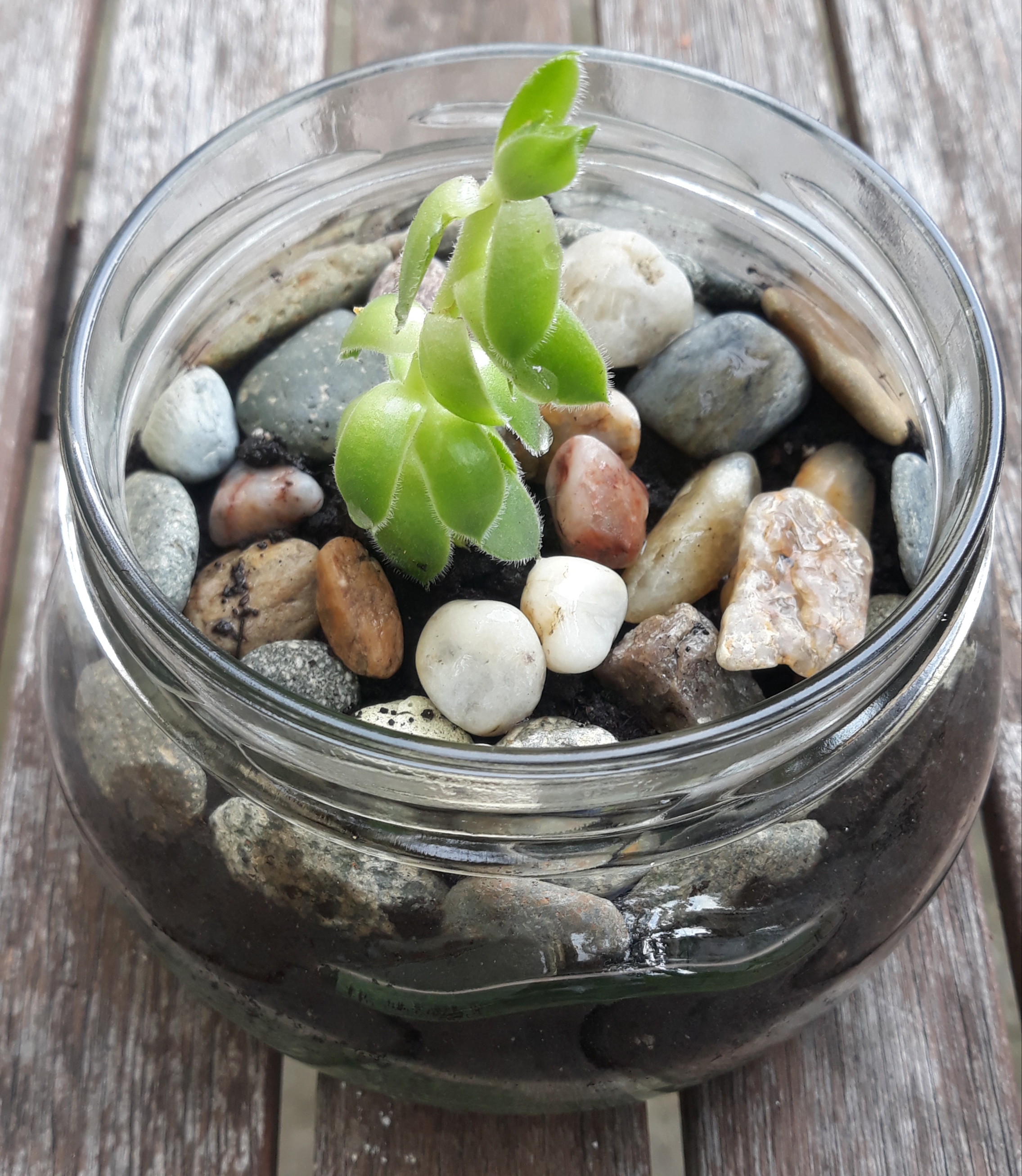 All the elements that were used to create the flowerpot had previous roles. The succulent plant is what's left of a flower arrangement. The jar was bought with pickels. The soil is from an old flowerpot. The pebbles were collected from the ground.