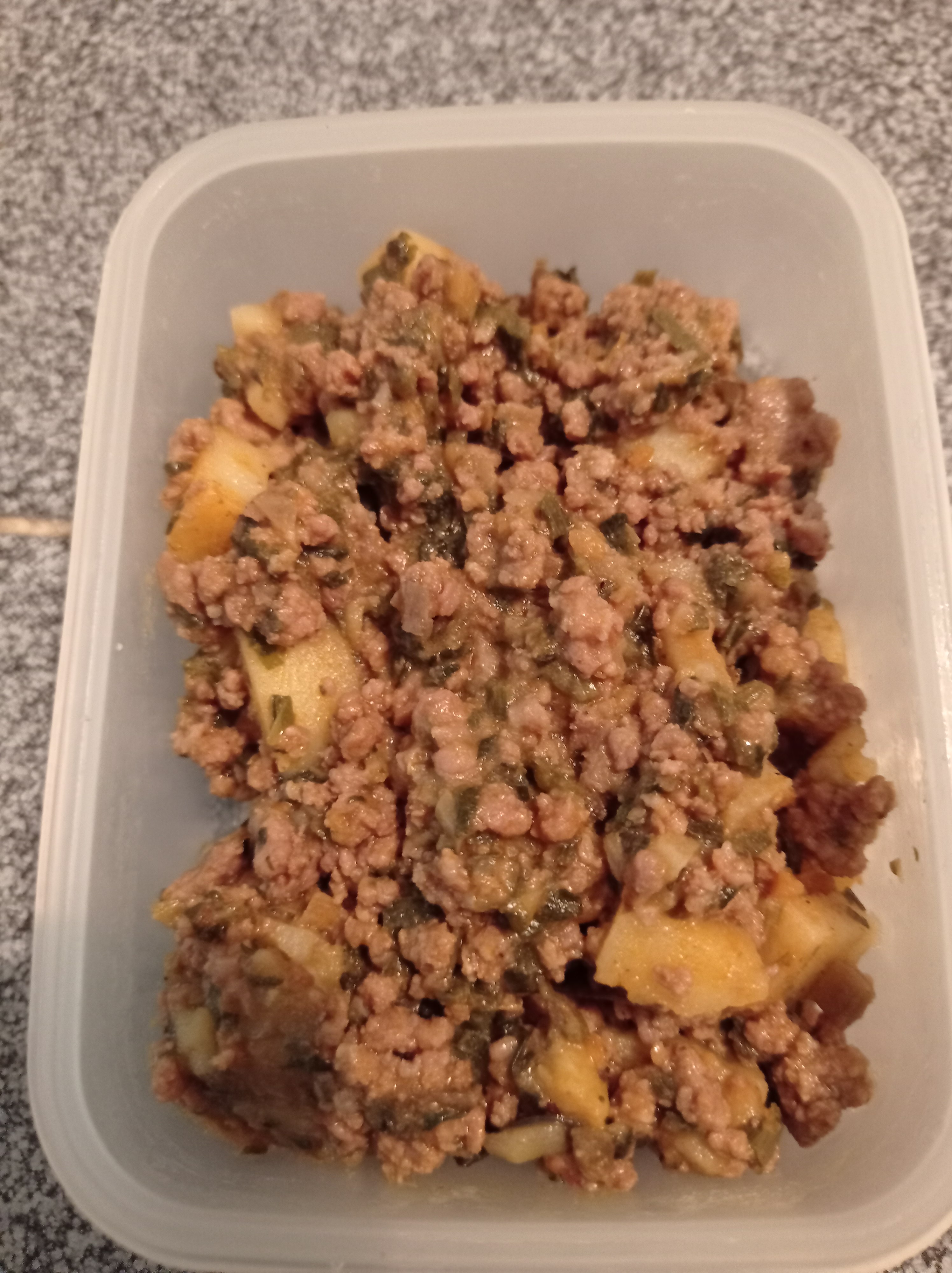Para preparar el relleno puse a sofreír, con un poquito de margarina y aceite, cebolla cortada en cuadritos pequeños, luego añadí ajo machacado. Cuando la cebolla estaba empezando a dorar agregué la carne molida y la moví con una cuchara por unos minutos para que se soltará. Agregué sal, achote en polvo, orégano, curry, comino, un toque de pimienta, revolvi para mezclar bien todo y agregué papa cortada en cubitos pequeños y un poquito de agua. Tapé la paila y movía de vez en cuando hasta que se cocinaron las papas.