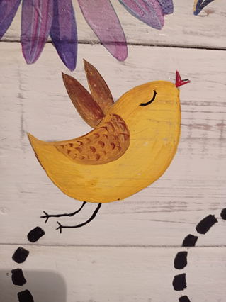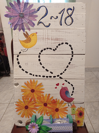 Para esto, mi hermano reutilizó unos trozos de madera de una casita de perro que se dañó hace tiempo, la dio una base de pintura y colgó la cestita que alguien me regaló y que aquí hace las veces de maceta. Yo me ocupé de dibujar y pintar los pajaritos, y hacer el resto de la decoración de la tabla con servilletas para decoupage y un poco de pintura.